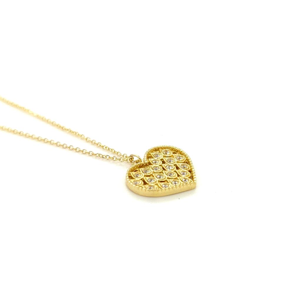 Ένα γυναικείο κολιέ από χρυσό K9 (375°) με καρδιά και ζιργκόν πέτρες.