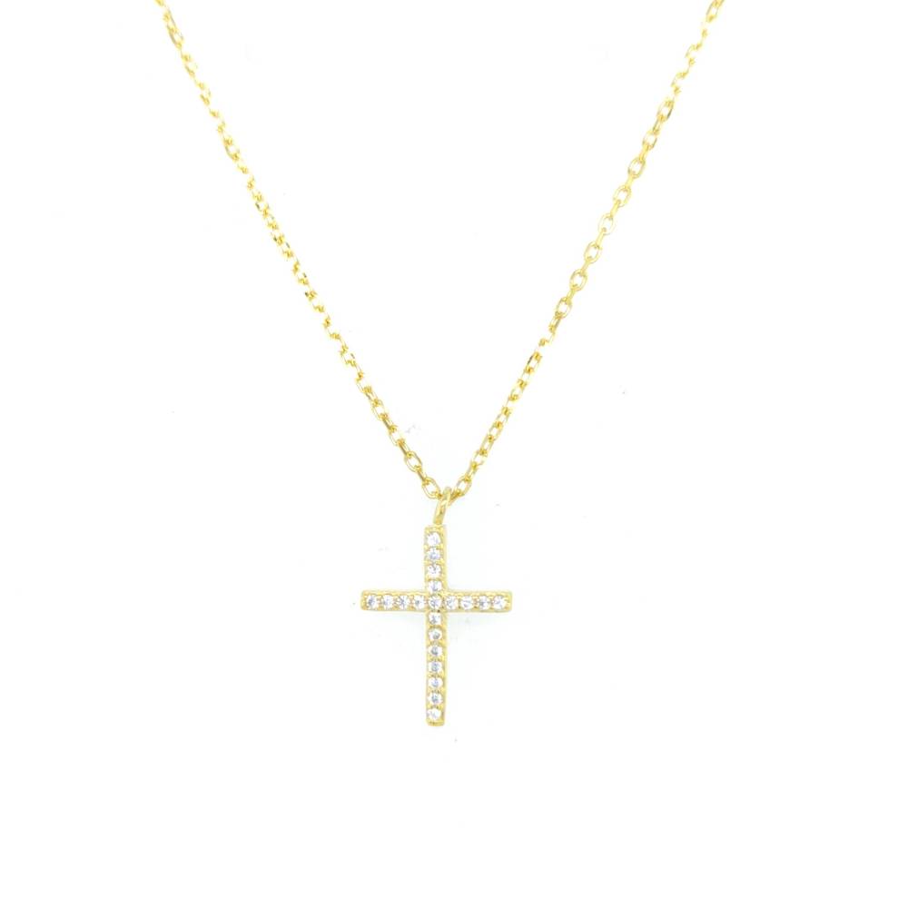 Γυναικείο κολιέ με σταυρό ο οποίος κοσμείται από ζιργκόν, φτιαγμένο από επιχρυσωμένο ασήμι (925°).