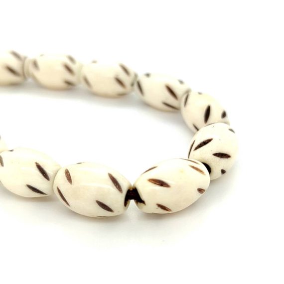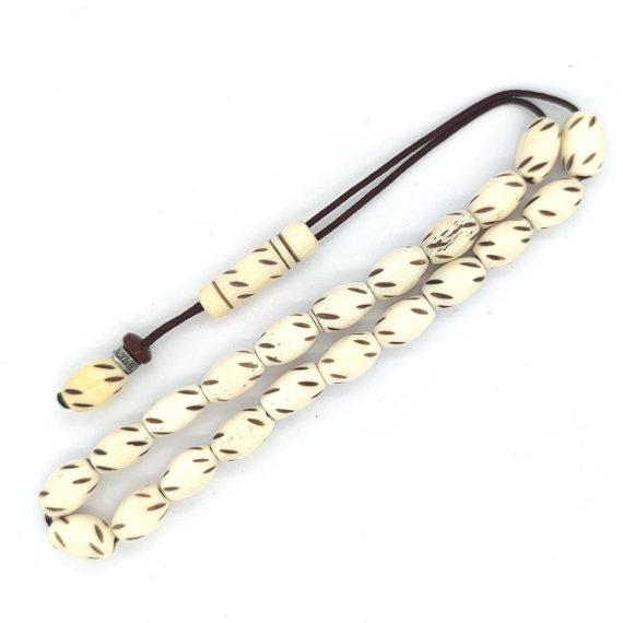 Bone is also used in the making of kombolois. A few centuries ago, people were making jewels and many other items for religious purposes. They were processing bones in a particular way creating thus pieces of art. The bones komboloys are qualitative and durable in use. The bone beads are from cattle animals that live in Asia, as well as from camels and elephants. In some of them, we find Tibetan graphs and colouring designs. The Asians sculptured with the hand many graphs on the beads from their daily life and religion.