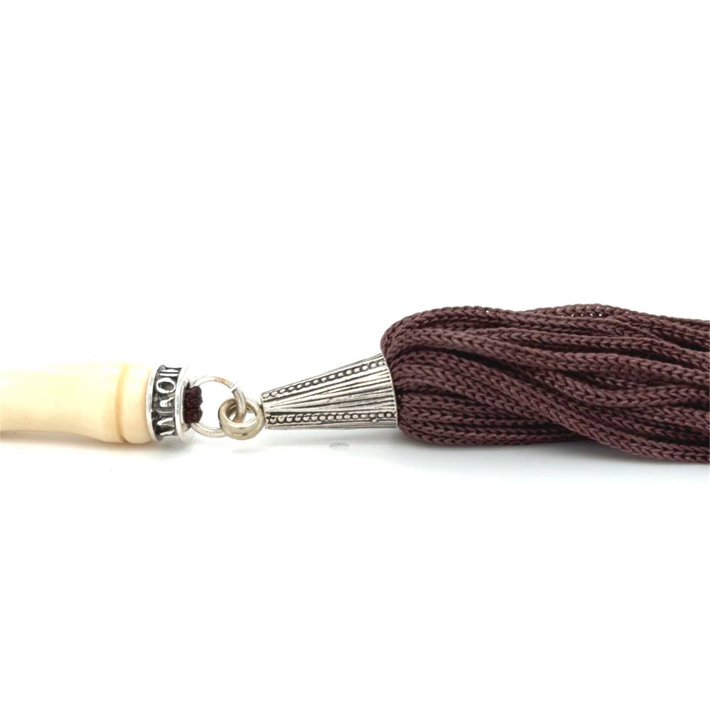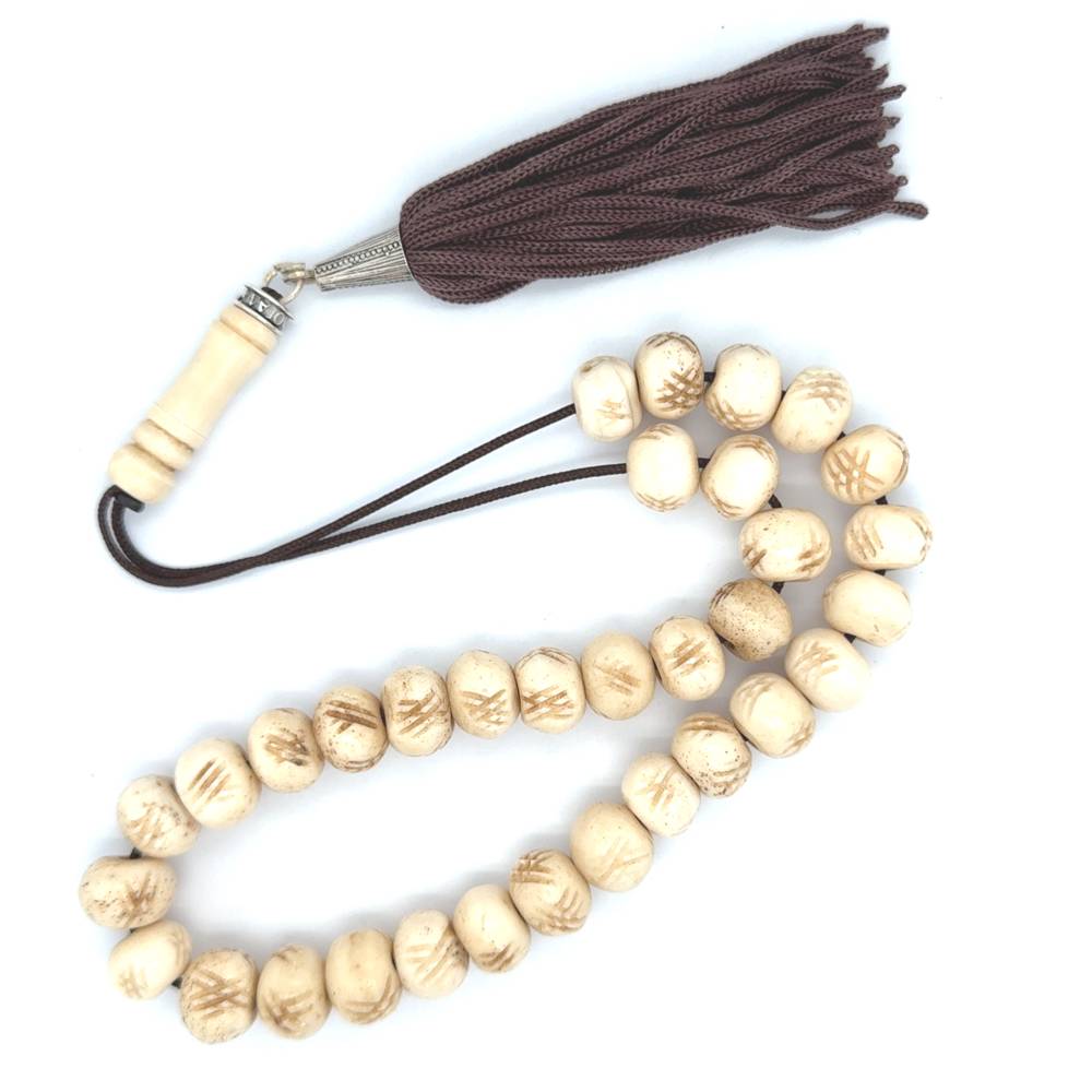 Kombolois carved camel bone white with tassel, 33 beads