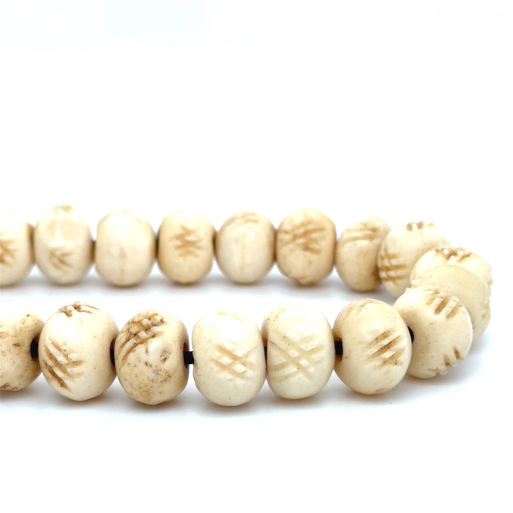 Bone is also used in the making of kombolois. A few centuries ago, people were making jewels and many other items for religious purposes. They were processing bones in a particular way creating thus pieces of art. The bones komboloys are qualitative and durable in use. The bone beads are from cattle animals that live in Asia, as well as from camels and elephants. In some of them, we find Tibetan graphs and colouring designs. The Asians sculptured with the hand many graphs on the beads from their daily life and religion.