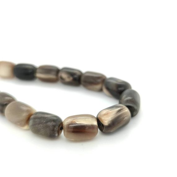 Για την κατασκευή χαντρών για τα κομπολόγια χρησιμοποιείται κυρίως κέρατο από ένα είδος βοοειδών, το ασιατικό γιακ και κέρατο από ταύρο και τάρανδο. Oι χάντρες από κέρατο είναι ευχάριστες και ανθεκτικές στη χρήση τους, δεν θρυμματίζονται και τις συναντάμε σε καφέ χρώμα, αλλά και μέσω μιας διαδικασίας χρωματισμού με βότανα, σε μπορντό, καφέ, αντίκ και μαύρο.