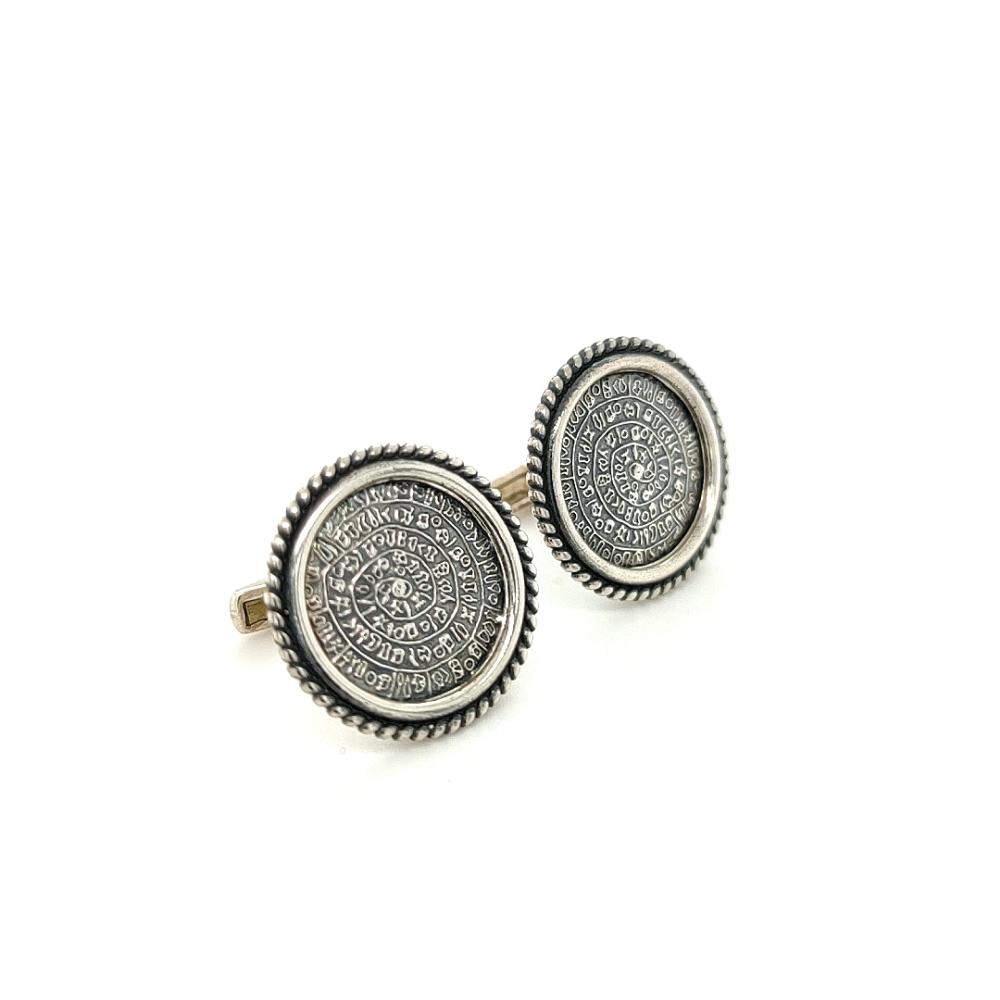 Ανδρικά μανικετόκουμπα από ασήμι (925°) με τον Δίσκο της Φαιστού. Ο Δίσκος της Φαιστού είναι δίσκος ψημένου πηλού, που αποτελεί αρχαιολογικό εύρημα από τη Μινωική πόλη της Φαιστού στη νότια Κρήτη και χρονολογείται πιθανώς στην μέση ή ύστερη Μινωική Εποχή του Χαλκού. Αποτελεί ένα από τα γνωστότερα μυστήρια της αρχαιολογίας, αφού ο σκοπός της κατασκευής του παραμένει άγνωστος. Άγνωστο είναι μέχρι σήμερα και το νόημα των αναγραφόμενων σε αυτόν.