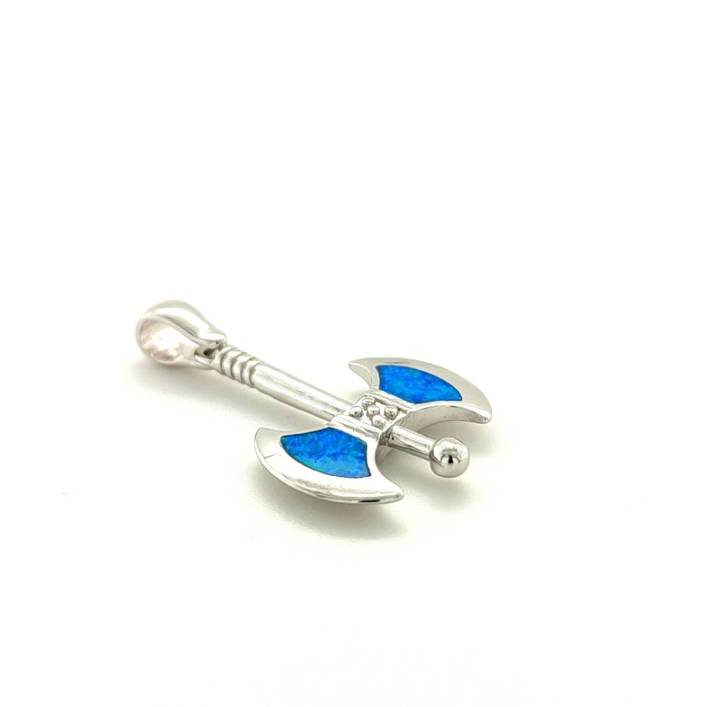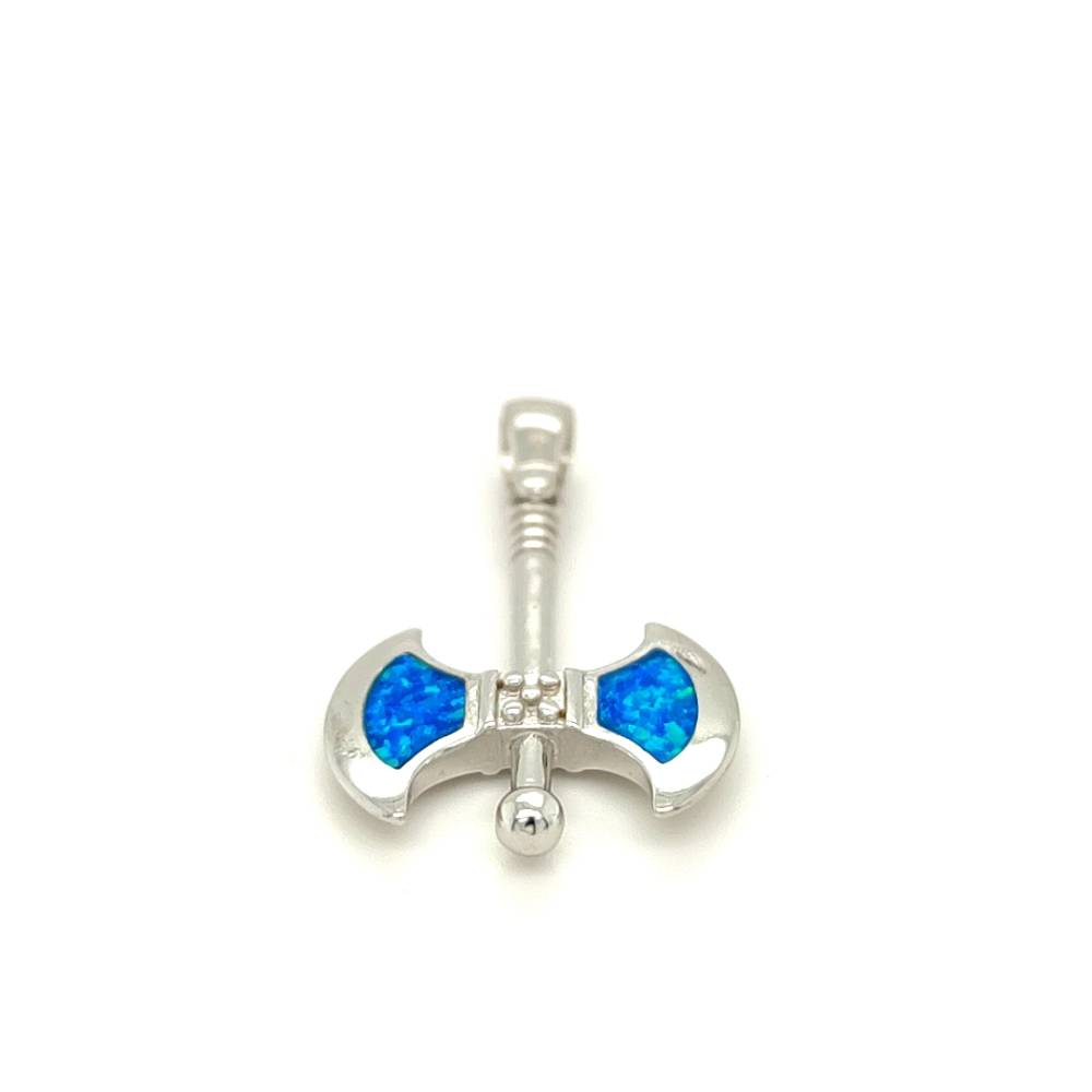 Γυναικείο μενταγιόν από ασήμι (925°) με Διπλό Μινωικό πέλεκυς και τεχνητό opal. Ο διπλός πέλεκυς είναι χαρακτηριστικό σύμβολο του μινωικού πολιτισμού. Δίκοπο τσεκούρι, προσαρμοσμένο σε ξύλινη λαβή, με διάφορες χρήσεις, σαν όπλο, ή ακόμα και σαν ιερό εργαλείο για αποκεφαλισμό ζώων σε θυσίες.