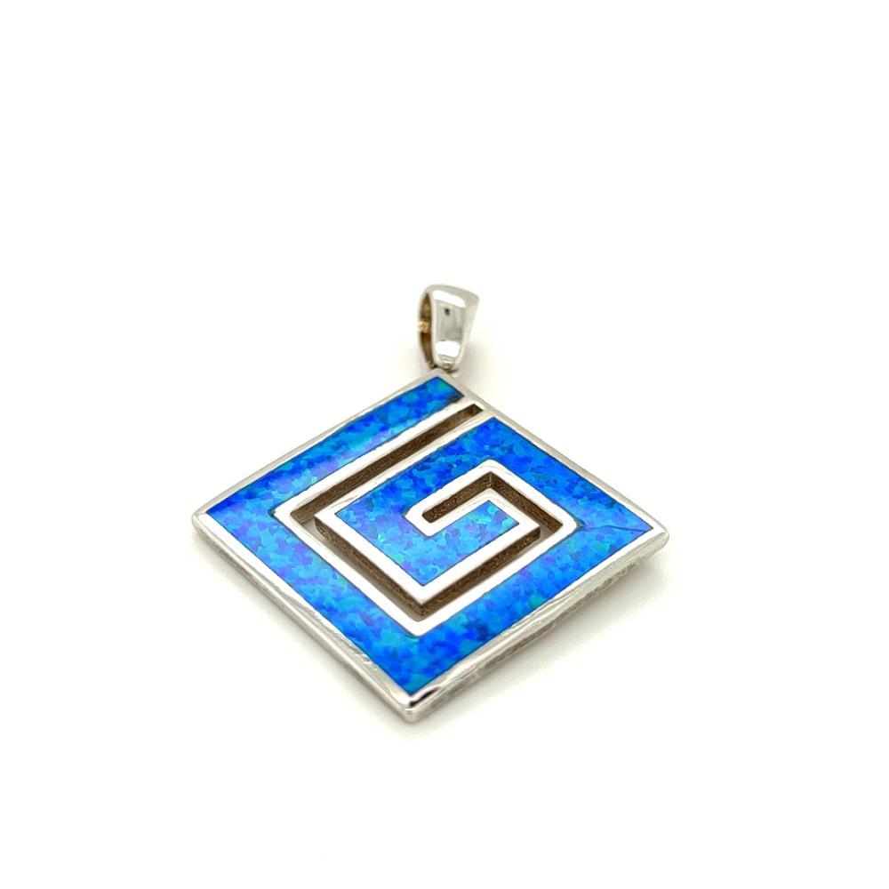 Γυναικείο μενταγιόν από ασήμι (925°) με σύμβολο Μαιάνδρου και τεχνητό opal. Ο Μαίανδρος είναι το αρχαιότερο ελληνικό σύμβολο, Νίκης και Ενότητας, σύμβολο του Άπειρου και της Αιώνιας Ζωής. Εμπνευσμένος, κατά την άποψη κάποιων ακαδημαϊκών, από τις πολυάριθμες στροφές του ποταμού Μαιάνδρου. Ο Μαίανδρος χρησιμοποιείται σε αγγεία, ναούς, μνημεία, γλυπτά, αντικείμενα, πολεμικά όπλα, πανοπλίες και κοσμήματα.