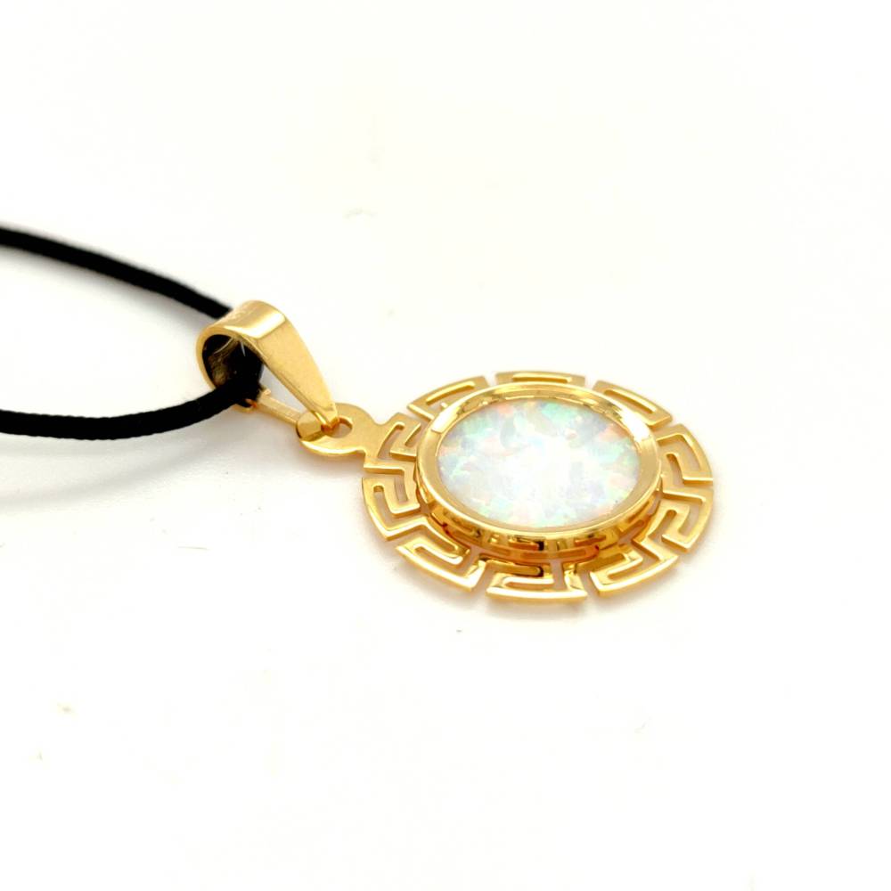 Μενταγιόν με μαύρο κορδόνι, χρυσός K14 (585°), λευκό τεχνητό opal με στεφάνι μαίανδρου