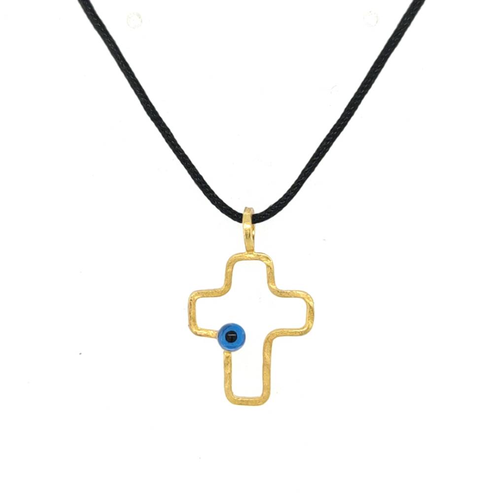 Μενταγιόν σε σχήμα σταυρού όπου στην άκρη υπάρχει ένα ματάκι μπλε. Το μενταγιόν συνοδεύεται από ένα κορδόνι μαύρο και από μια παραμάνα.