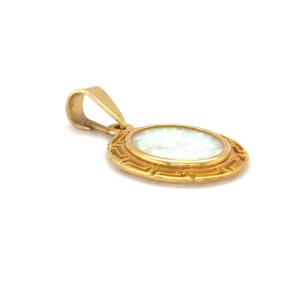 Pendant, gold K14 (585°), white artificial opal with a wreath of meander oval