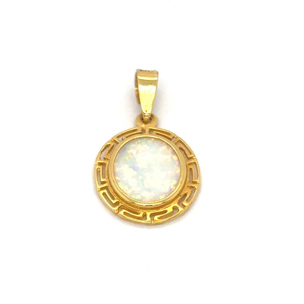 Women’s pendant made of gold K14 (585°) with Meander symbol and white artificial opal. Meander is the most ancient Greek symbol, Victory and Unity, a symbol of Infinity and Eternal Life. Inspired, in the opinion of some academics, by the numerous turns of the river Meander. Meander is used in pottery, temples, monuments, sculptures, objects, weapons, armor and jewelry.