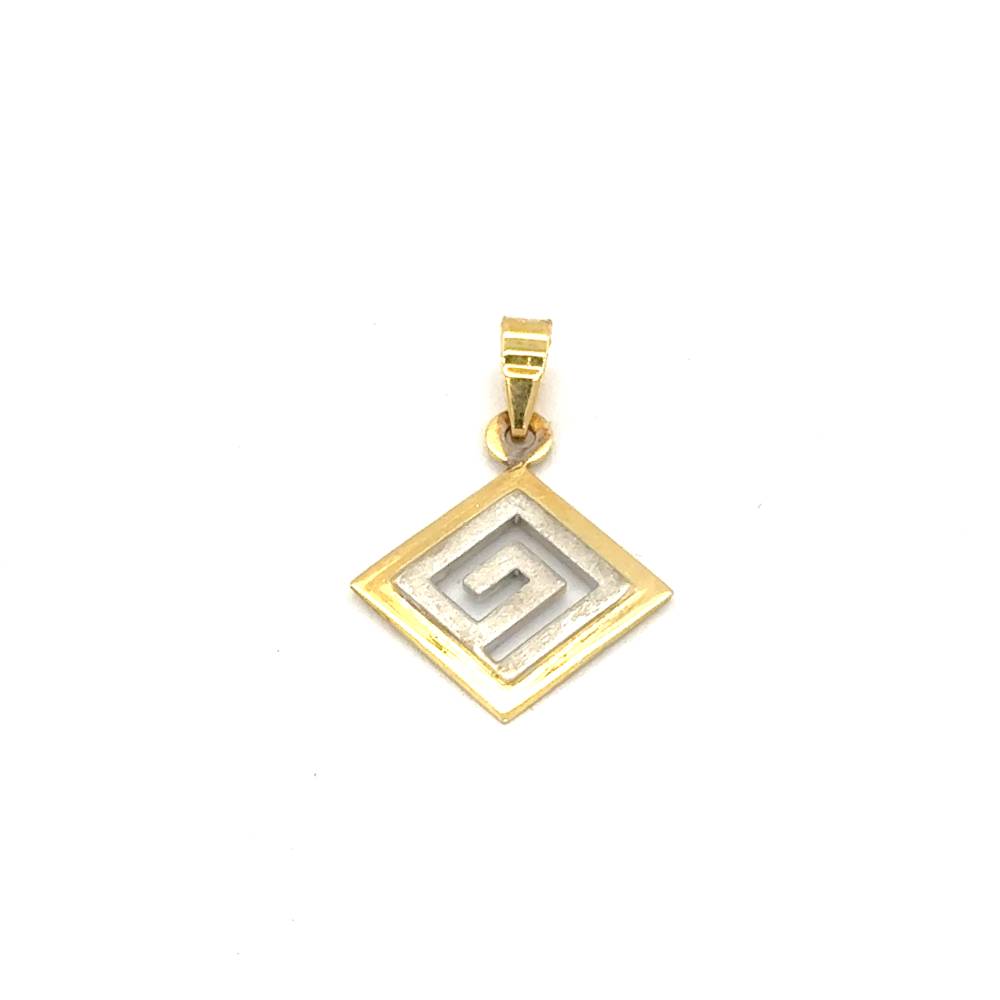 Pendant made of yellow and white gold K14 (585°) with Meander symbol. Meander is the most ancient Greek symbol, Victory and Unity, a symbol of Infinity and Eternal Life. Inspired, in the opinion of some academics, by the numerous turns of the river Meander. Meander is used in pottery, temples, monuments, sculptures, objects, weapons, armor and jewelry.