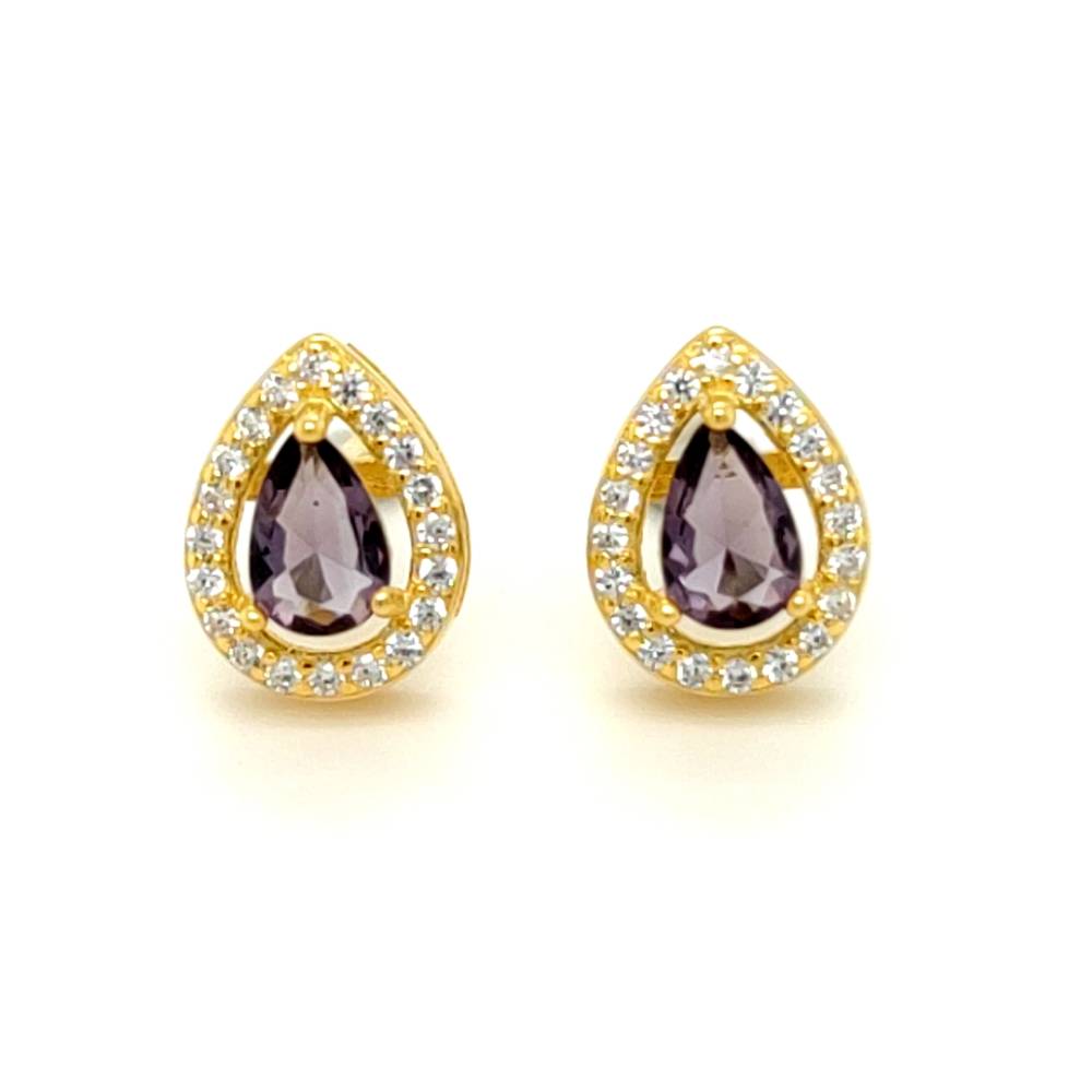 Σκουλαρίκια γυναικεία επίχρυσα, ροζέτα δάκρυ με μωβ κρύσταλλο-ασήμι (925°)