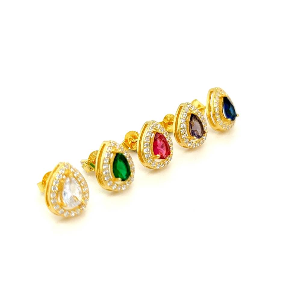 Σκουλαρίκια γυναικεία επίχρυσα, ροζέτα δάκρυ με μπλε κρύσταλλο-ασήμι (925°)