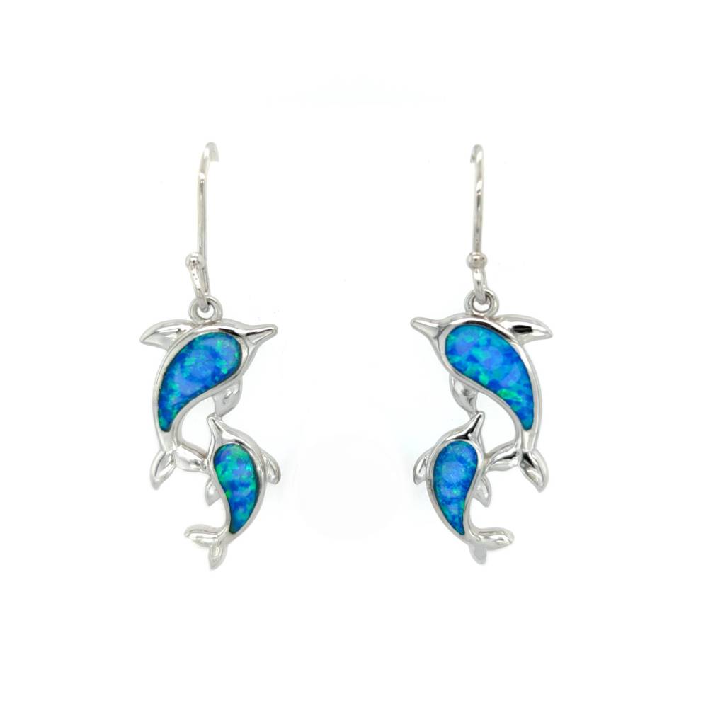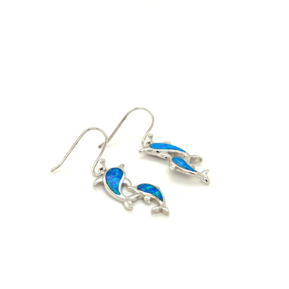 Γυναικεία σκουλαρίκια κρεμαστά από ασήμι (925°) με δελφίνια και τεχνητό opal. Το δελφίνι από την αρχαιότητα ήταν ένα από τα βασικά θέματα διακόσμησης των σπιτιών και των νομισμάτων. Σαν σύμβολο των Ολύμπιων θεών είχε πάρει πολύ σημαντική θέση στην αρχαία τέχνη σαν διακοσμητικό μοτίβο ή σαν καλλιτεχνική παράσταση. Συναντάται στις τοιχογραφίες στα ανάκτορα της ΚΝΩΣΟΥ, στο μέγαρο της βασίλισσας. Από αυτό υποθέτουμε ότι είχε βασική θέση στην κρητική μυθολογία και στον ΜΙΝΩΙΚΟ πολιτισμό.