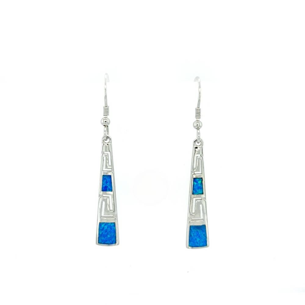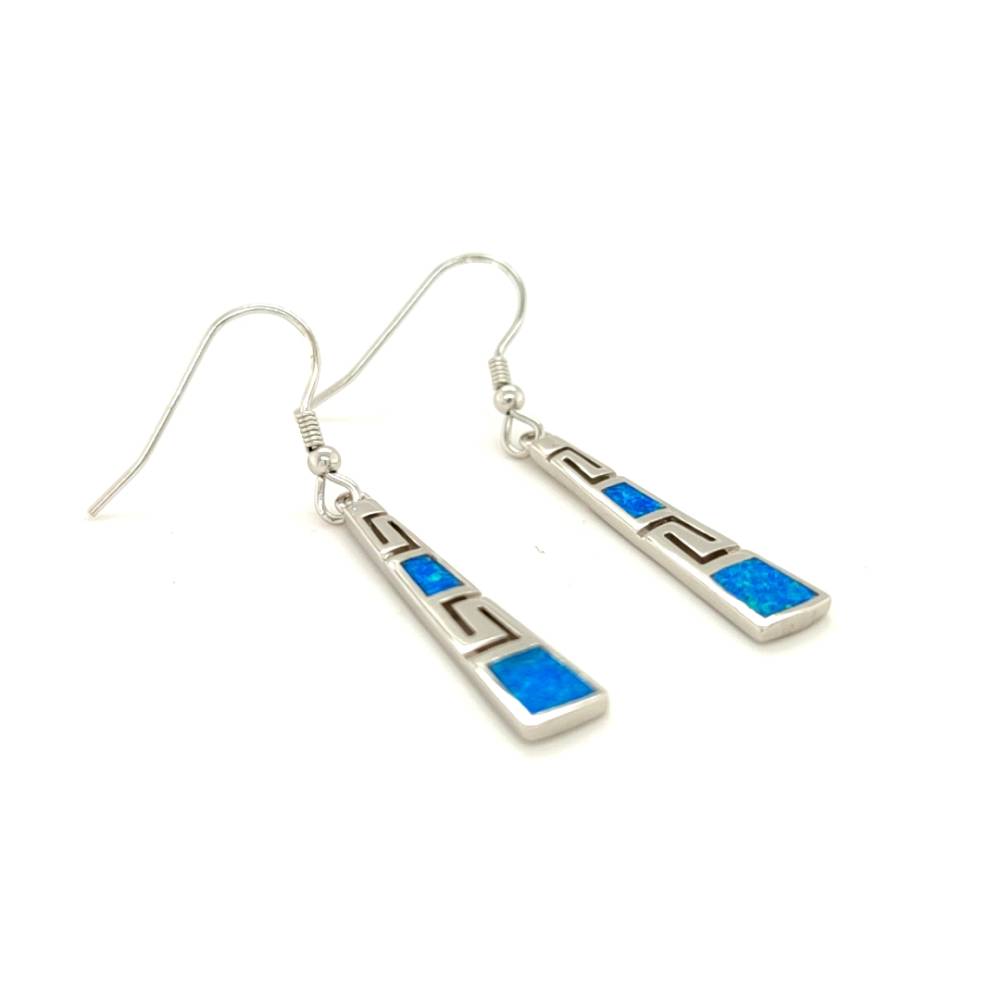 Γυναικεία σκουλαρίκια από ασήμι (925°) με σύμβολο Μαίανδρο με τεχνητό opal. Ο Μαίανδρος είναι το αρχαιότερο ελληνικό σύμβολο, Νίκης και Ενότητας, σύμβολο του Άπειρου και της Αιώνιας Ζωής. Εμπνευσμένος, κατά την άποψη κάποιων ακαδημαϊκών, από τις πολυάριθμες στροφές του ποταμού Μαιάνδρου. Ο Μαίανδρος χρησιμοποιείται σε αγγεία, ναούς, μνημεία, γλυπτά, αντικείμενα, πολεμικά όπλα, πανοπλίες και κοσμήματα.