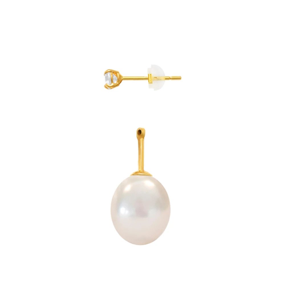 Ζευγάρι κρεμαστά σκουλαρίκια με λευκά μαργαριτάρια Fresh Water Pearl 8,5×11 mm σε σχήμα Long. Η βάση του είναι χρυσή Κ14 (585°). Τα σκουλαρίκια αποτελούνται από 2 τμήματα. Το ένα τμήμα είναι καρφωτό σκουλαρίκι K14 (585°) με ζιργκόν διαμέτρου 3 mm και το άλλο μία βάση Κ14 (585°) στην οποία υπάρχει το μαργαριτάρι, με συνολικό μήκος περίπου 2 εκατοστά. Η βάση είναι αποσπώμενη και έτσι βγάζοντάς την δημιουργούνται 2 διαφορετικά ζευγάρια σκουλαρίκια. Διαθέτει κούμπωμα σιλικόνης με χρυσά στοιχεία K14 (585°) στο εσωτερικό της. Το κούμπωμα με σιλικόνη είναι ιδανικό για γυναίκες που έχουν αλλεργία ή ευαισθησία σε σκουλαρίκια με μέταλλο χρυσό ή ασήμι. Τα μαργαριταρένια σκουλαρίκια είναι τα μοναδικά διαχρονικά κοσμήματα που υπάρχουν από την αρχαιότητα έως και σήμερα.
