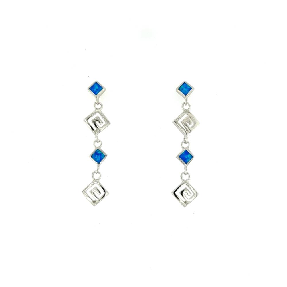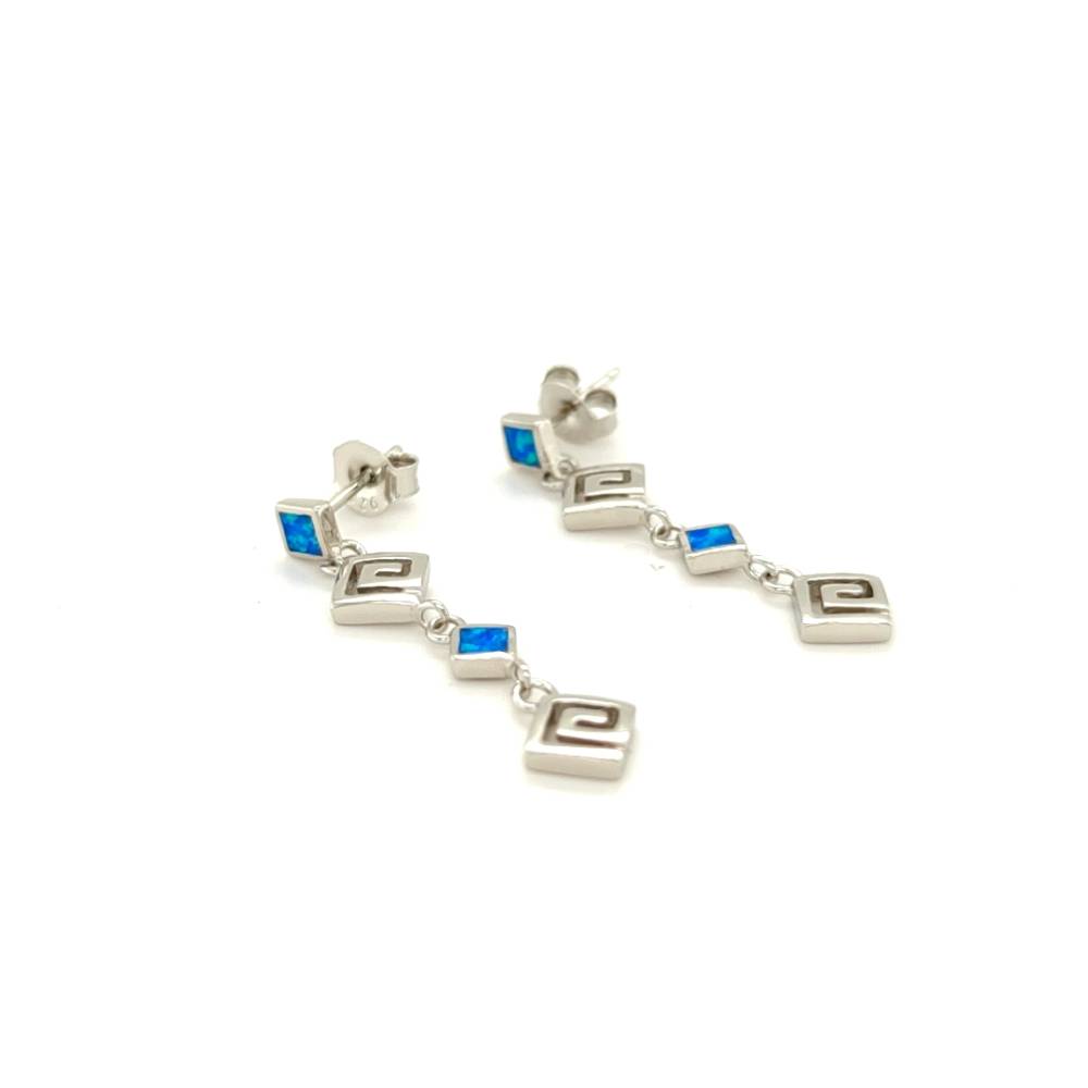 Γυναικεία σκουλαρίκια από ασήμι (925°) με σύμβολο Μαίανδρο με τεχνητό opal. Ο Μαίανδρος είναι το αρχαιότερο ελληνικό σύμβολο, Νίκης και Ενότητας, σύμβολο του Άπειρου και της Αιώνιας Ζωής. Εμπνευσμένος, κατά την άποψη κάποιων ακαδημαϊκών, από τις πολυάριθμες στροφές του ποταμού Μαιάνδρου. Ο Μαίανδρος χρησιμοποιείται σε αγγεία, ναούς, μνημεία, γλυπτά, αντικείμενα, πολεμικά όπλα, πανοπλίες και κοσμήματα.