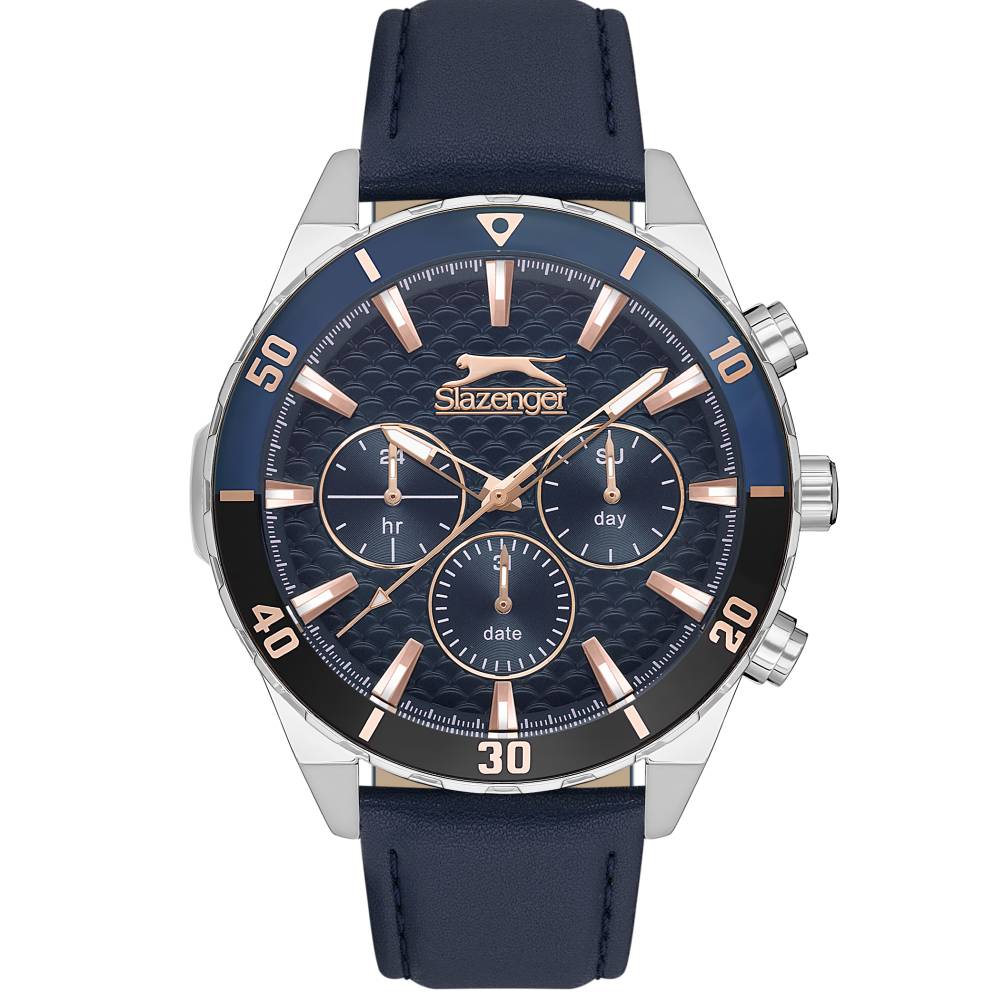 Ανδρικό ρολόι με μπλε δερμάτινο λουράκι και μπλε καντράν. H Slazenger είναι μία από τις μεγαλύτερες καθιερωμένες αθλητικές μάρκες στον κόσμο με σχεδόν 150 χρόνια παγκόσμιας παρουσίας. Οι συλλογές ρολογιών Slazenger είναι διαχρονικές, σπορ, κομψές και μοντέρνες για χρήση στην καθημερινή ζωή.
