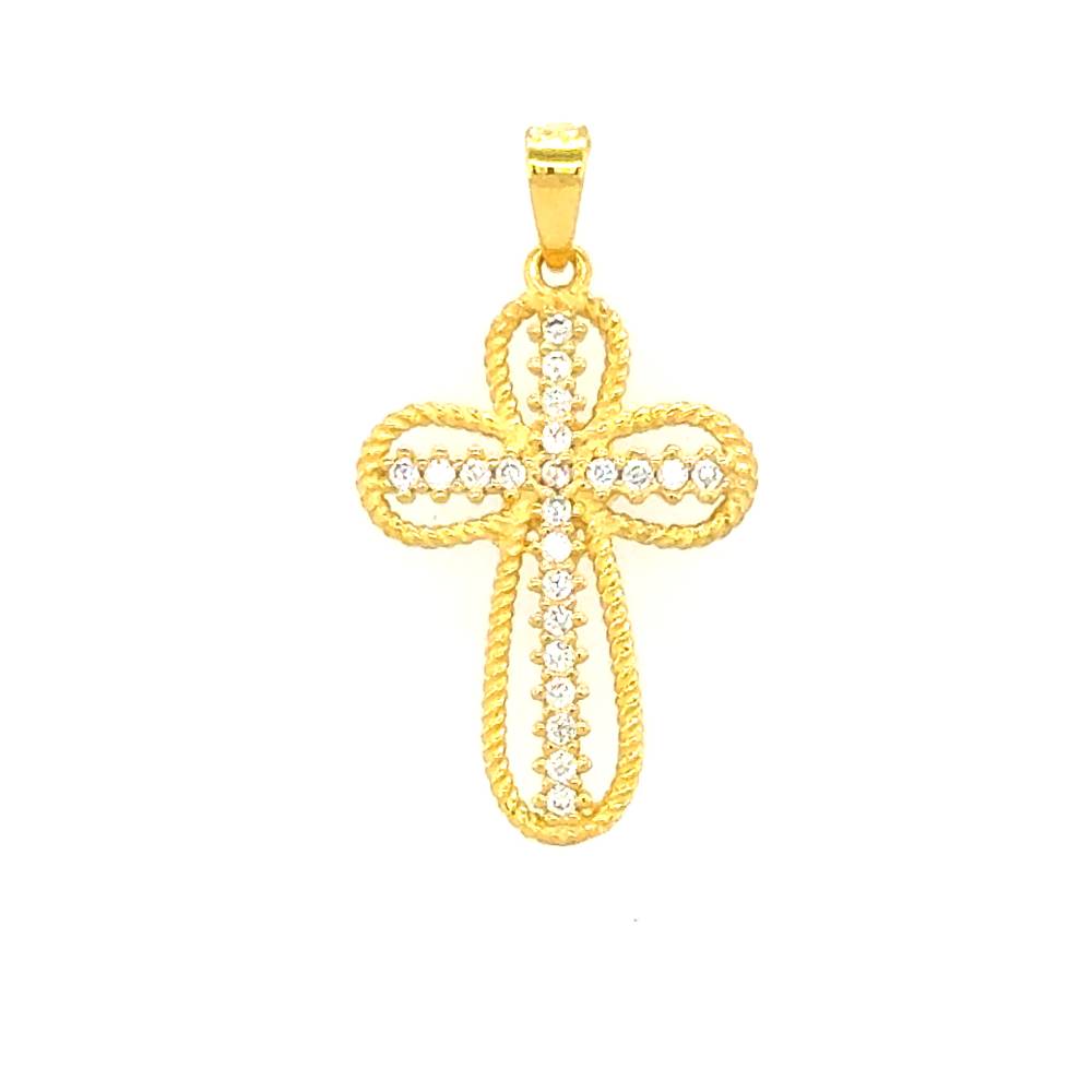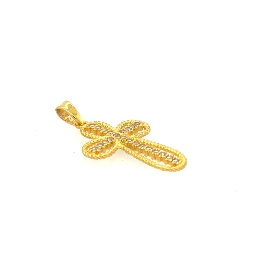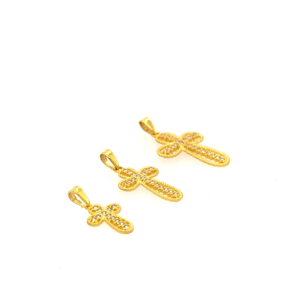 Ένας γυναικείος σταυρός ο οποίος κοσμείται από ζιργκόν. Ο σταυρός είναι φτιαγμένο από χρυσό Κ9 (375°).