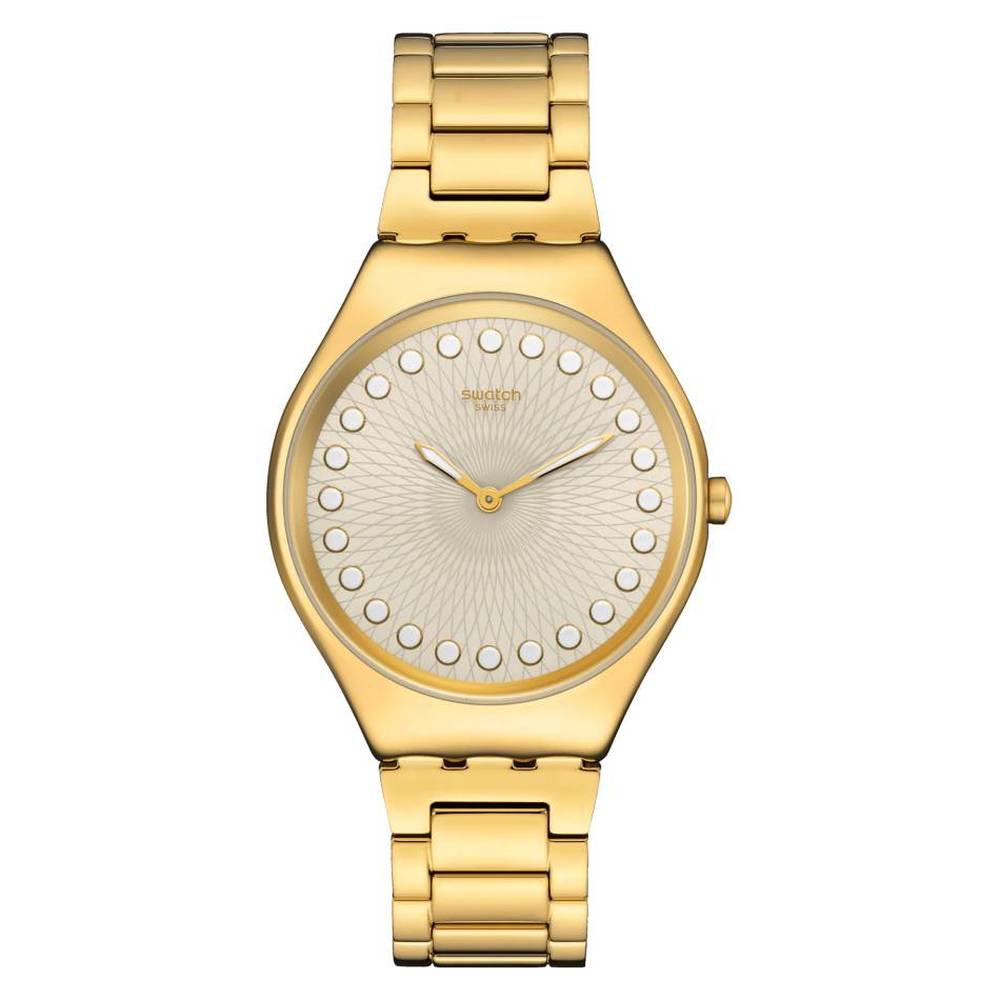 Αυτό το εξαιρετικά λεπτό χρυσαφί γυναικείο ρολόι διαθέτει σικάτο μπεζ καντράν με χρυσαφί και λευκή εκτύπωση και χρυσαφί δείκτες που λάμπουν στο σκοτάδι σε λευκό χρώμα. Διαθέτει τζάμι από ορυκτό γυαλί, αστραφτερή χρυσαφί κάσα PVD και ταιριαστό ρυθμιζόμενο μπρασελέ με κούμπωμα τύπου πεταλούδα.