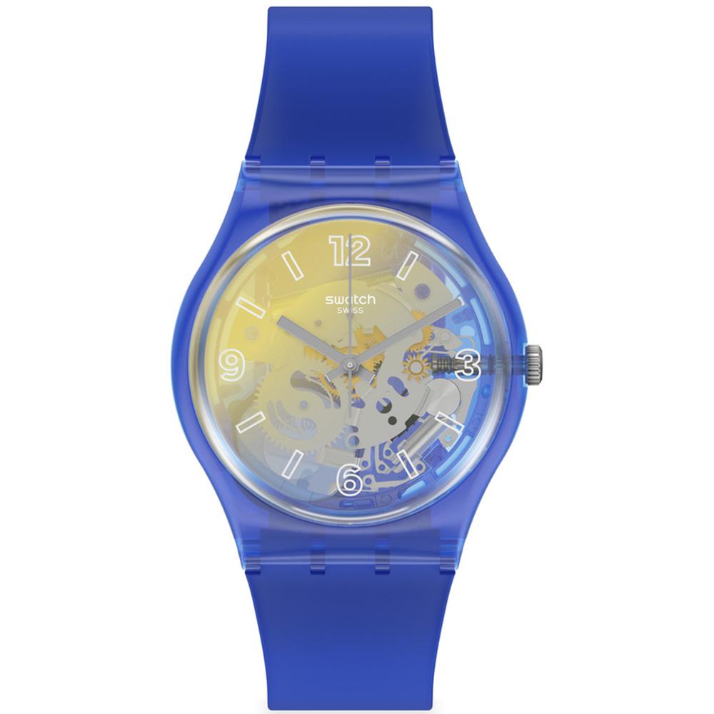The transparent matte blue silicone strap and shiny blue plastic case create a lively contrast with the stunning yellow gradient on this watch’s dial.