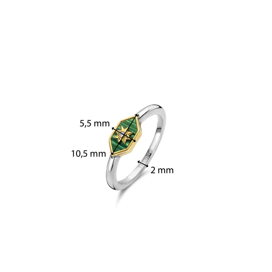 This TI SENTO gold-plated ring 12311MA flaunts an enchanting malachite green stone handset in a radiant yellow gold-plated setting. At the heart of the malachite is a radiant golden star motif with a sparkling cubic zirconia centre, symbolising the star’s warmth and brilliance. Symbol of transformation and healing, the malachite green stone carries positive energy and protection. This captivating ring is crafted from the highest quality 925 sterling silver and then plated with yellow gold for an opulent and warm touch. Let it decorate your fingers with its sophisticated glow and vintage-inspired shape. Wear it solo or stack it with some dainty bands to create your own stacked masterpiece. All our rings are completely nickel-free and hypoallergenic.