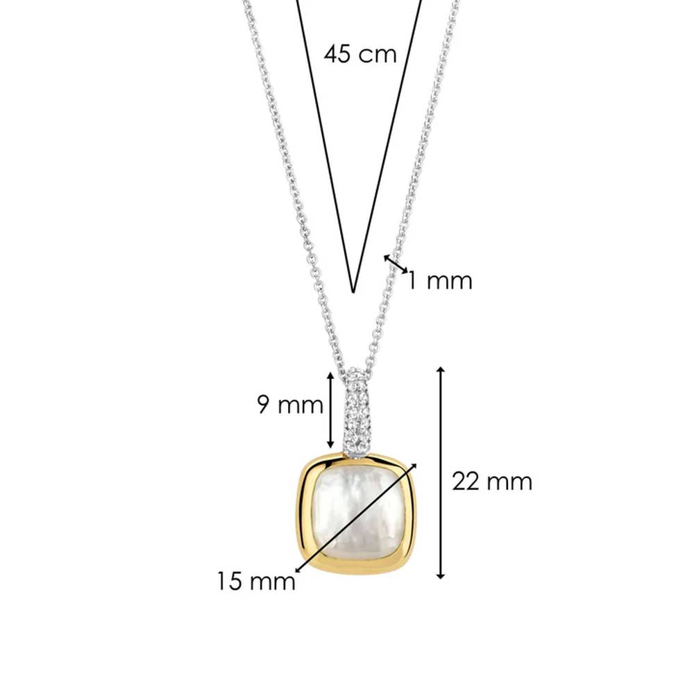 This TI SENTO gold-plated pendant 6829MW showcases a mother of pearl cushion shaped stone handset in a radiant yellow gold-plated setting. A harmonious blend of sleek geometry and vibrant colours. The funky cushion shape, symbolising stability and direction, showcases TI SENTO’s iconic design elements. The pendant features a pave of dazzling cubic zirconia, adding luminosity and glamour to the design. Crafted from premium 925 sterling silver, this piece seamlessly combines modern sophistication with timeless elegance. Add a touch of luxury to your hands, stack and combine it with the unexpected. The pendant comes with a dainty silver chain necklace. Like all our jewellery, this pendant is nickel-free and hypoallergenic, promising not just style, but also comfort and quality that stands the test of time.