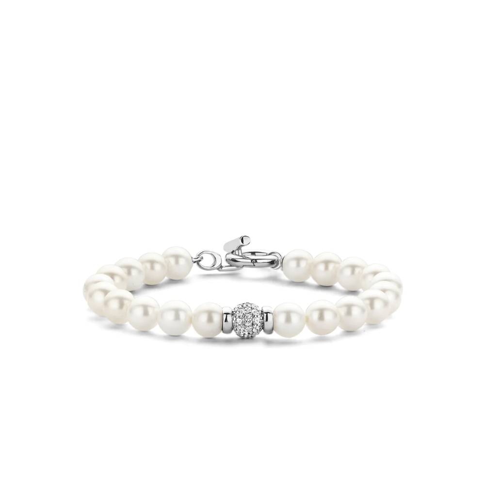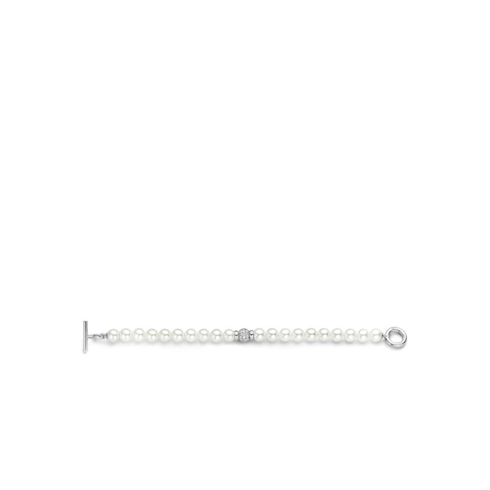 This elegant TI SENTO bracelet is formed of white pearls. As a distinctive additional design feature, this bracelet also sparkles with a single silver bead studded with pavé-set white zirconias. The bead is spaced on either side with single links of highly-polished silver. The T-lock clasp is also made of high-quality sterling silver and all silver elements are rhodium plated to ensure long life and protection from scratching and natural discoltheation.