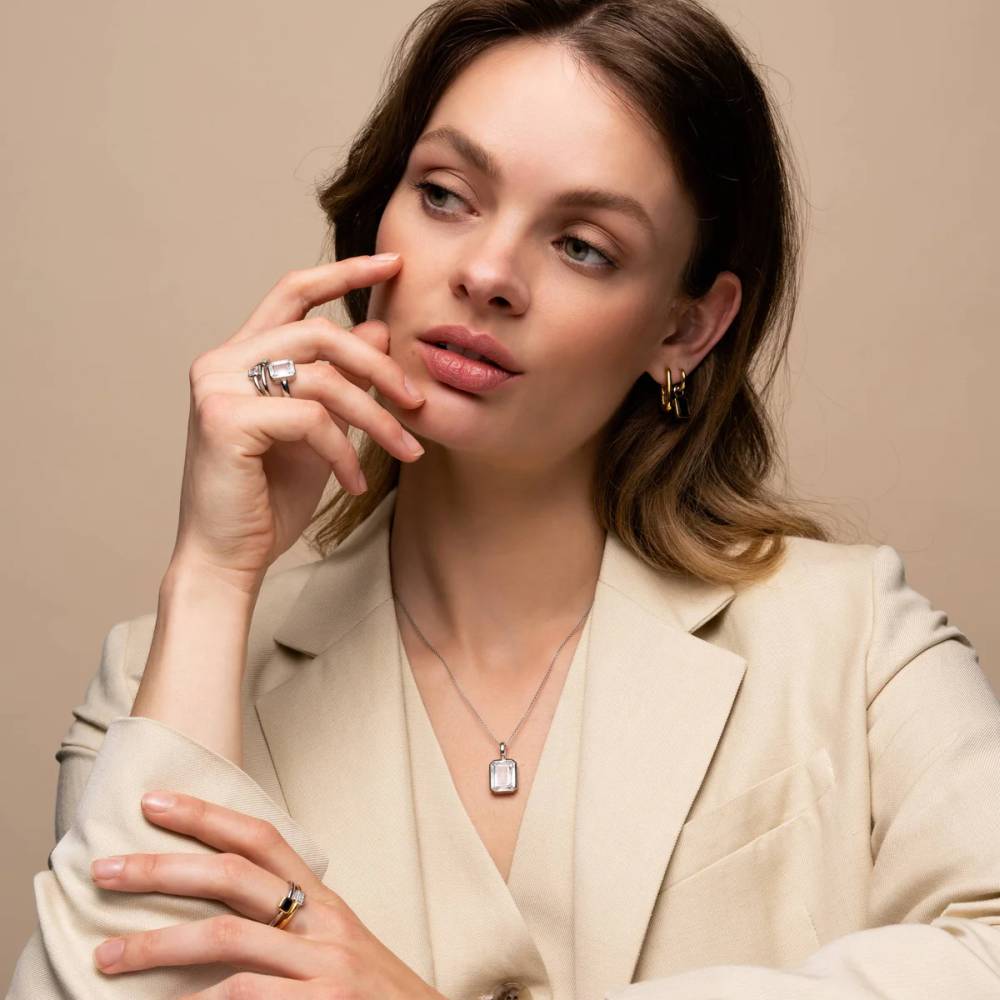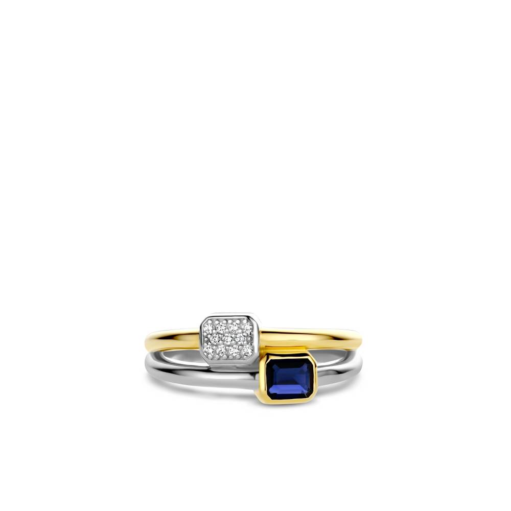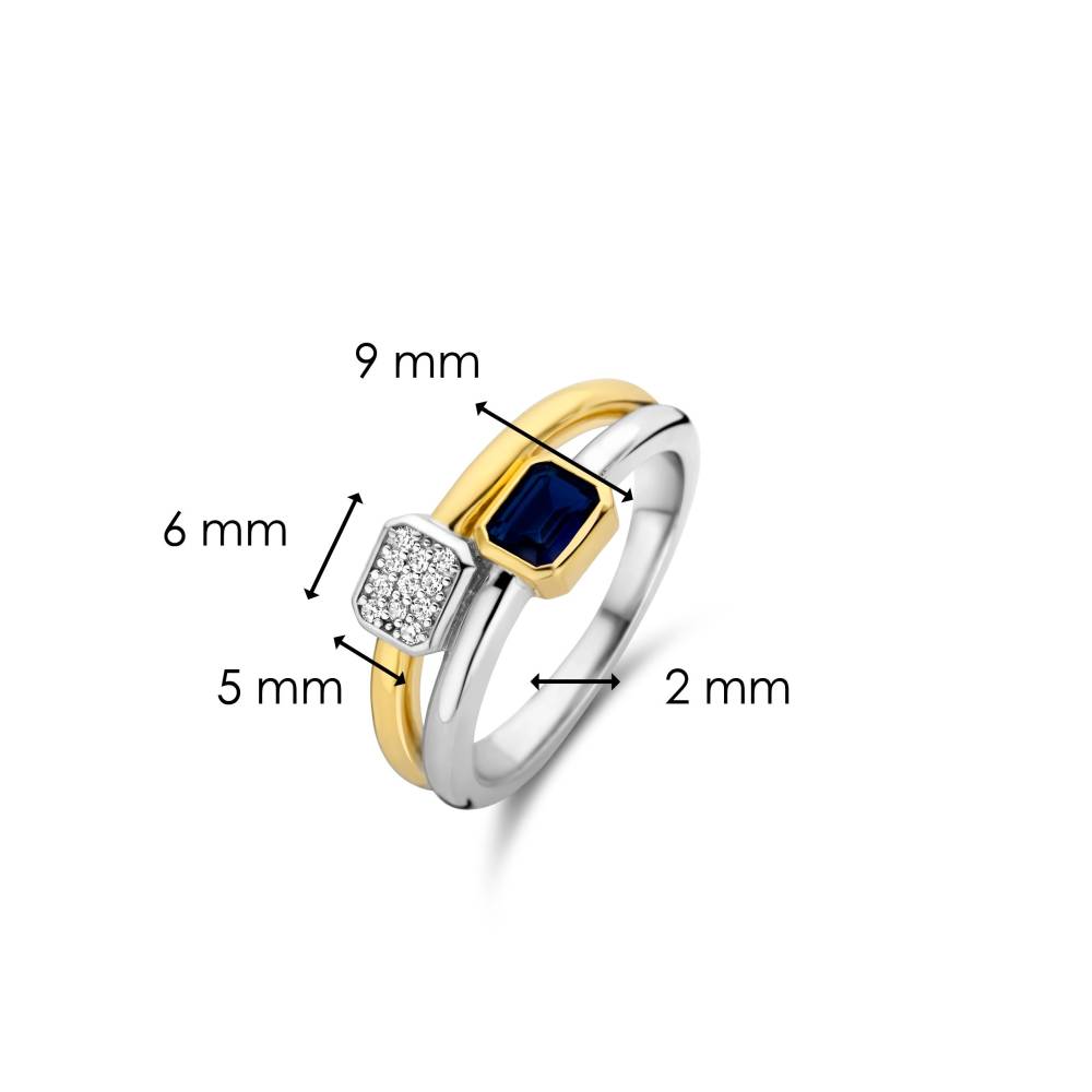 This TI SENTO gold-plated silver ring 12275BY features two rings blended in one. One of the rings has a dark blue stone handset in a gold-plated setting and the other features a pavé of white cubic zirconia stones. The ring is crafted from 925 sterling silver and coated with a thick layer of platinum to protect it and keep it luminous. One of the bands is plated with yellow gold. Let this playful and sophisticated piece elevate your look.