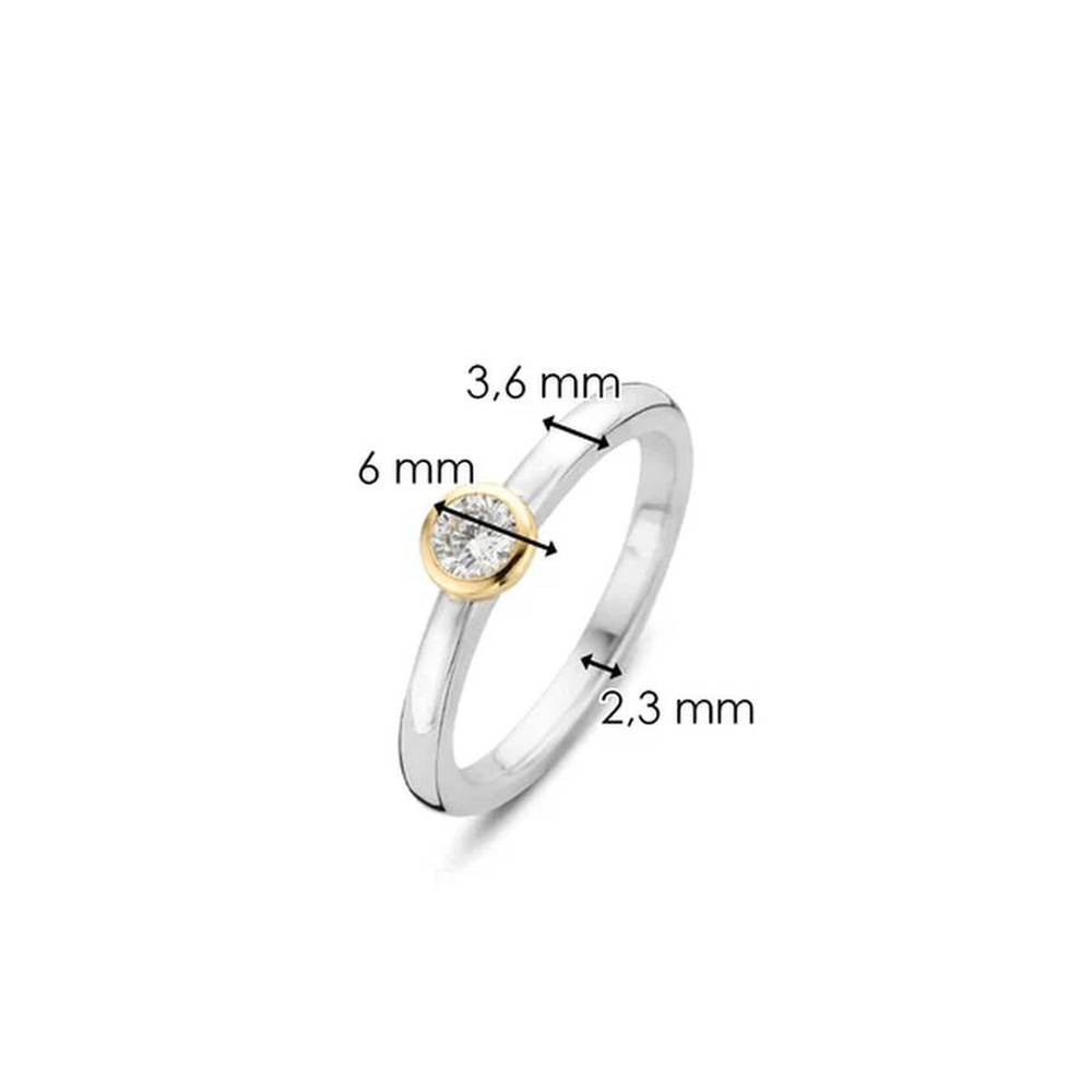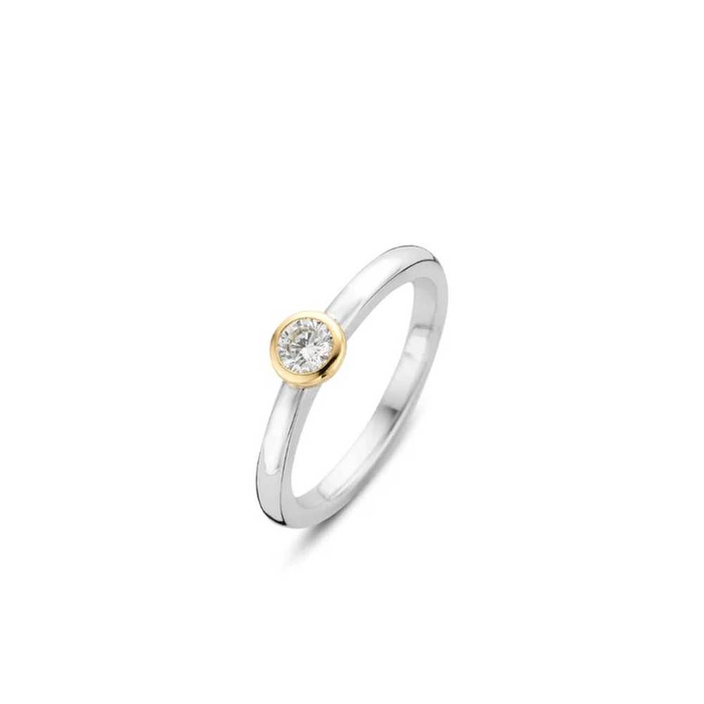 TI SENTO silver ring. The solitaire ring is made of rhodium plated sterling silver. The setting around the zirconia is yellow gold plated, allowing you to combine this ring with both gold and silver jewellery.