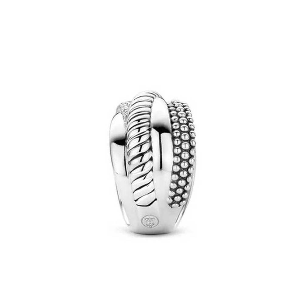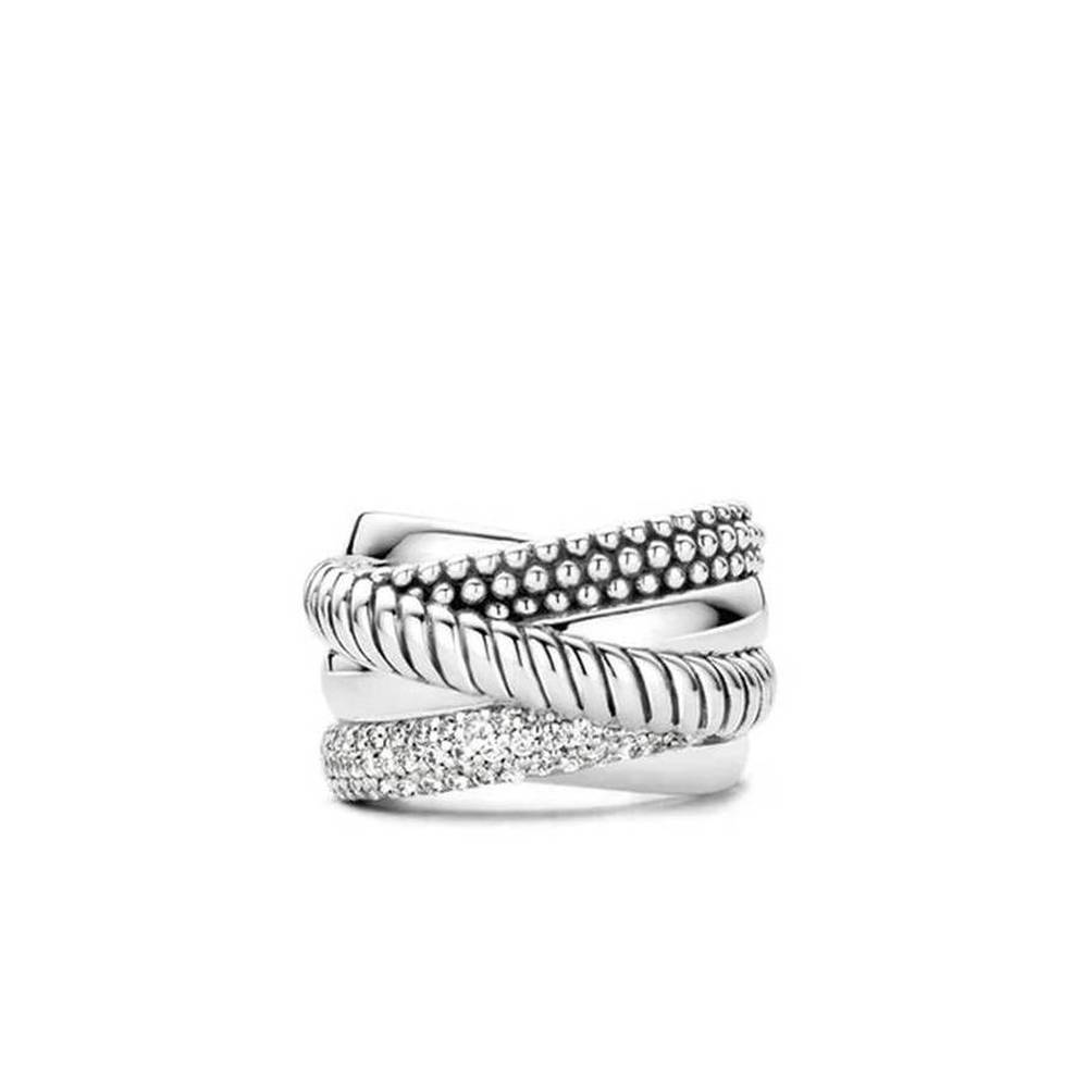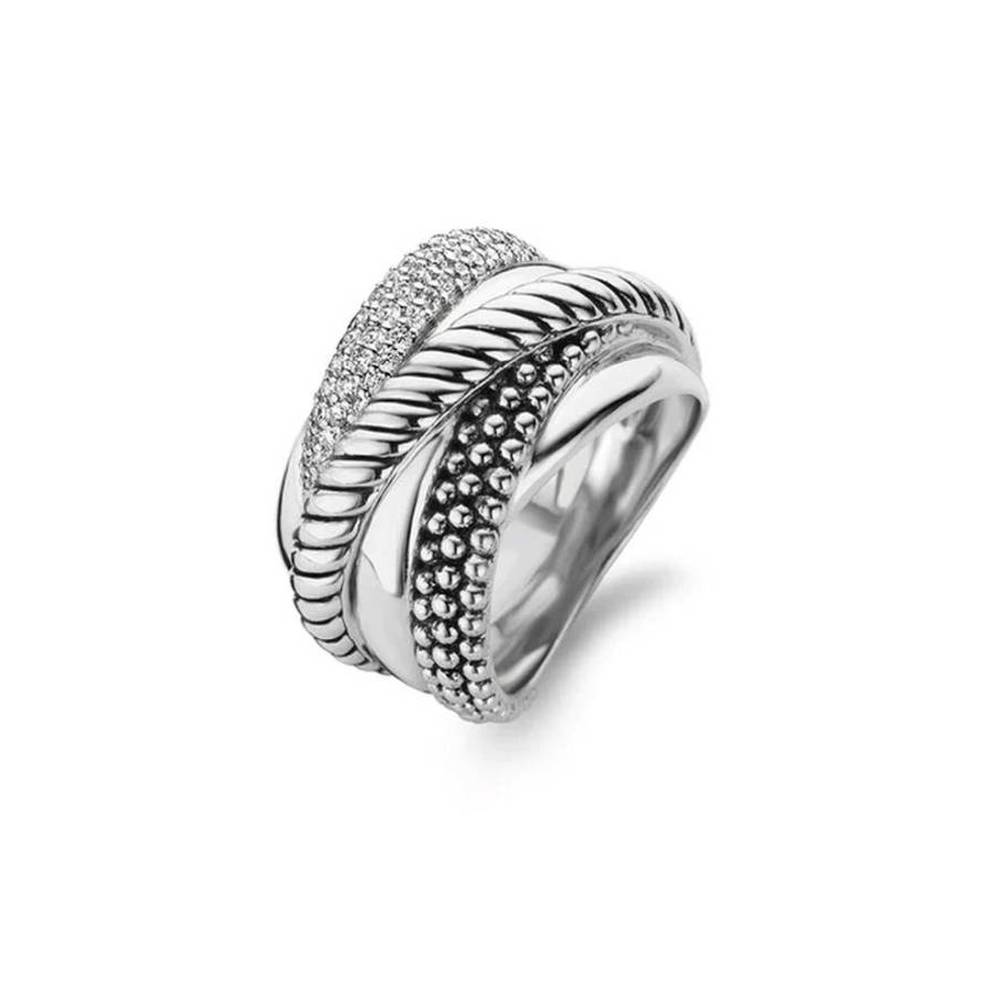This beautiful TI SENTO ring has six layers of rhodium-plated sterling silver stacked on top of each other. The different finishes merge to create a trendy and elegant design and it also features a line of sparkling, pavé set zirconias. The twisted layer of silver, along with the characteristic oxidised rhodium plating, gives the ring even more depth. The same result is created by the layer of silver bubbles. As a balance, the finish is smooth on the other layers. This ring also has a wider visible side and a narrower back, for maximum comfort for the wearer.