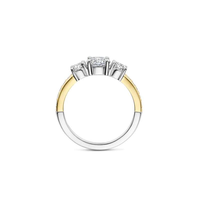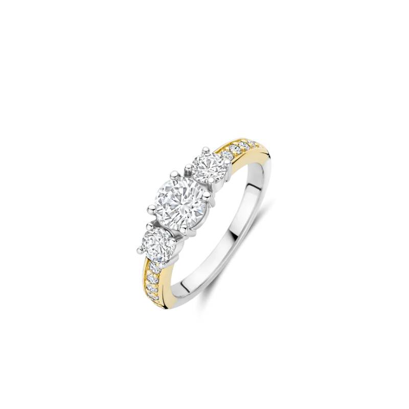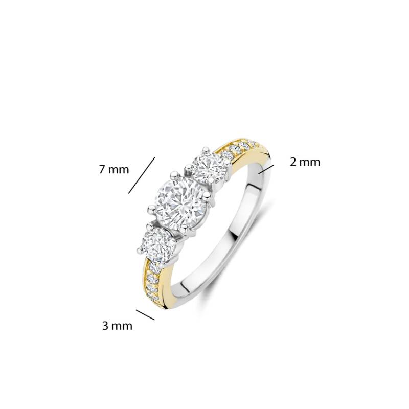 This gold-plated ring with zirconia stones is crafted from high-quality 925 sterling silver and features a refined, layered design. The band is fully set with sparkling zirconia stones, while three larger zirconia stones are placed centrally. This composition creates depth and an elegant play of light, with the central stones subtly enhanced by the shimmering pavé band.