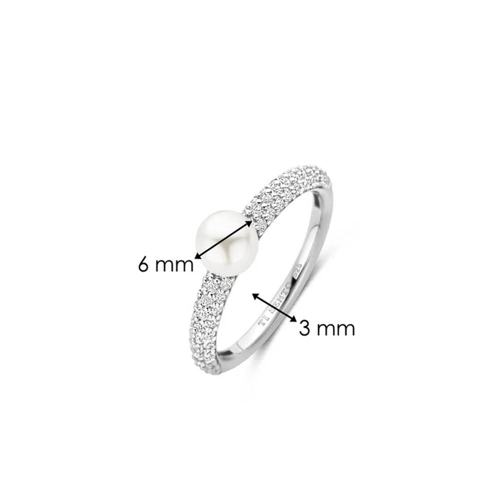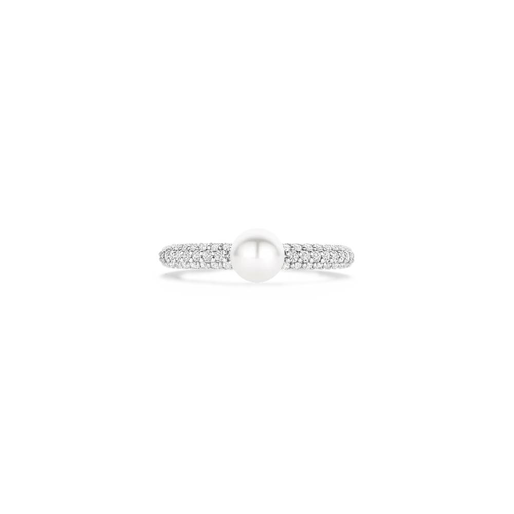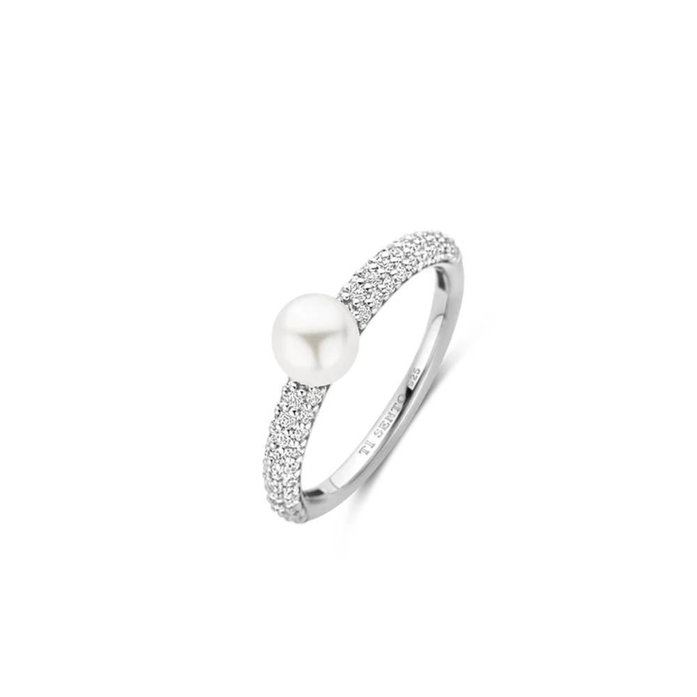 Indulge in timeless elegance with this TI SENTO Pearl Silver Ring 12347PW. Crafted from 925 sterling silver and plated with platinum for lasting brilliance, this ring features a delicate band adorned with a dazzling row of white cubic zirconia stones. At its centre, a captivating white pearl takes centre stage, surrounded by a halo of shimmering cubic zirconia stones. This ring is a perfect fusion of classic and contemporary design, offering a touch of understated luxury. The combination of the pearl’s natural beauty and the brilliance of the cubic zirconia creates a mesmerising effect. Let this ring be the highlight of your refined aesthetic. Wear it alone for a minimalist statement or layered with other TI SENTO pieces for a curated look that exudes effortless chic. Crafted with care for sensitive skin, this nickel-free and hypoallergenic ring ensures lasting comfort and quality.