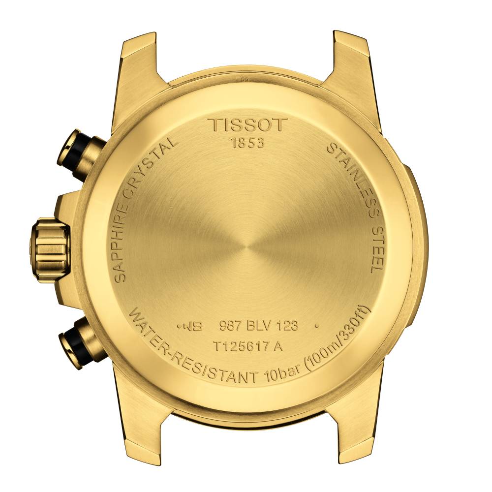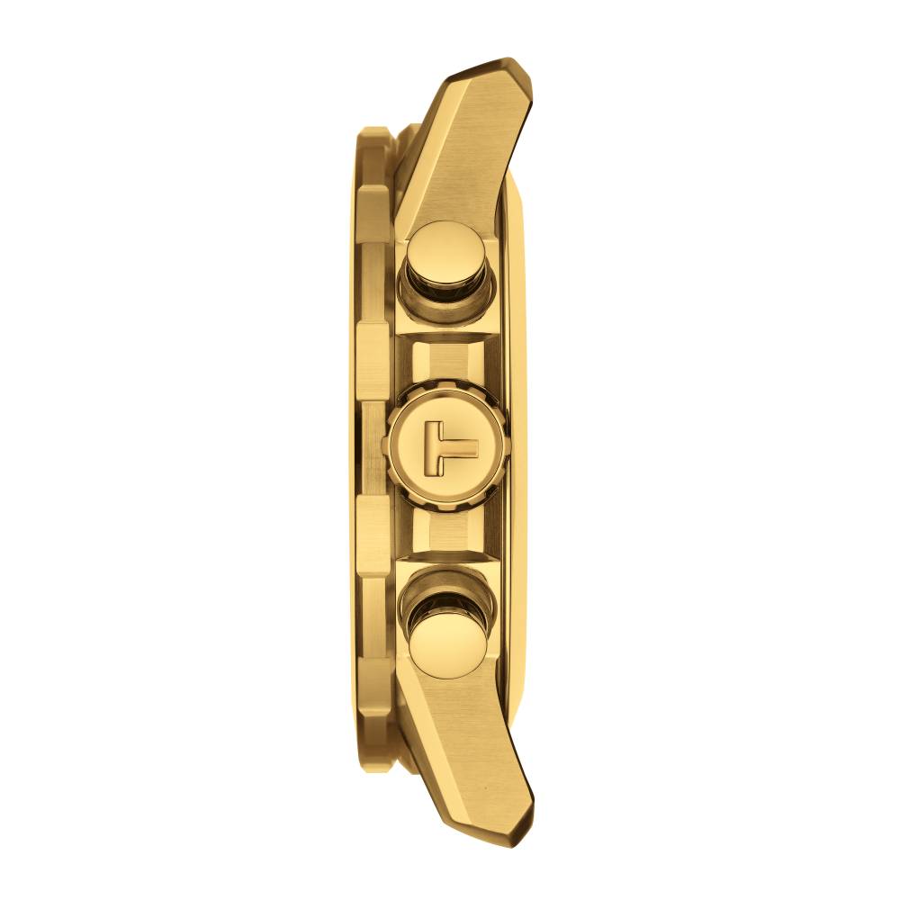 The Tissot Supersport Chrono is a masculine and dynamic collection, which offers a wide range of references giving everyone the possibility to pick the watch which fits best to their wrist. This chronograph, powered by a quartz movement, is the quintessence of modern sportiness. The indices give a better visibility of the time and add depth to the dial. Discover this 46mm watch with its gold PVD case, matching bracelet and contrasting black dial, for a bold and sporty look.