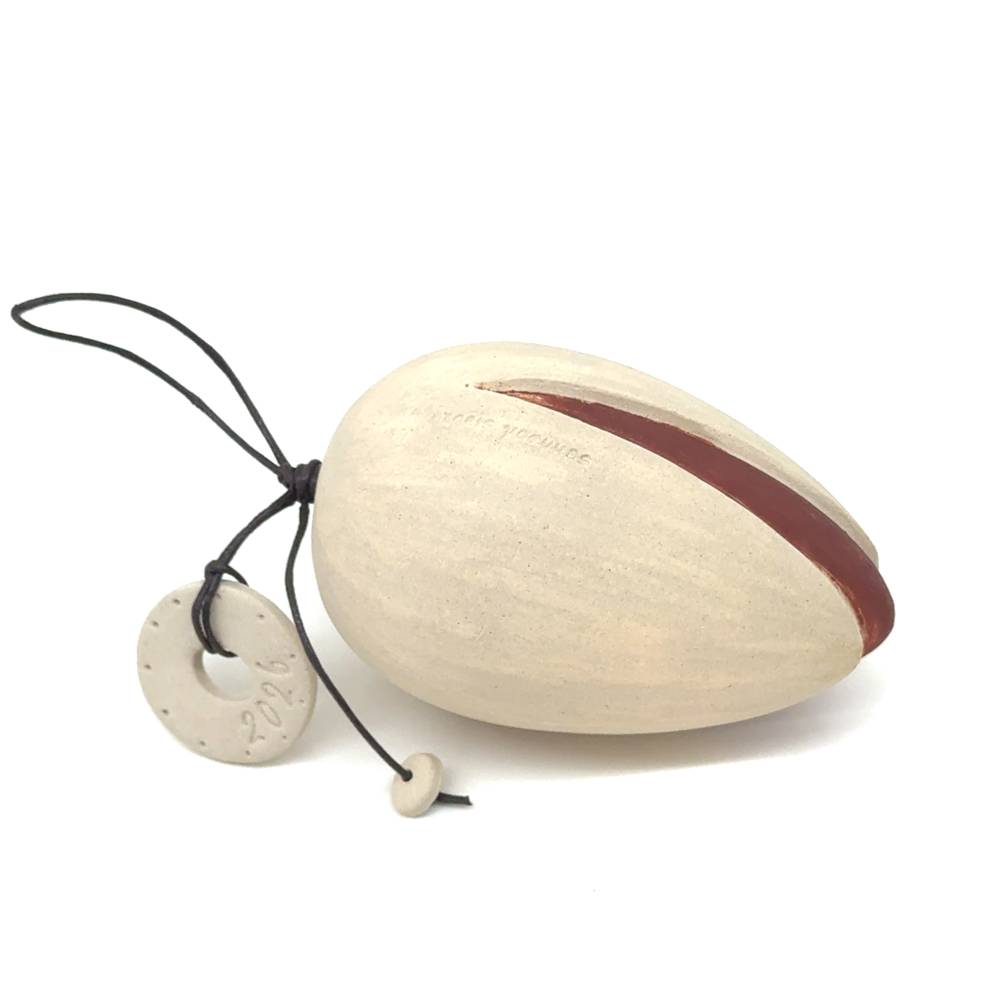A handmade Christmas peanut 2026 in beige and tile coloring from the ceramics workshop THREE LINES. Colors may differ relatively from reality.