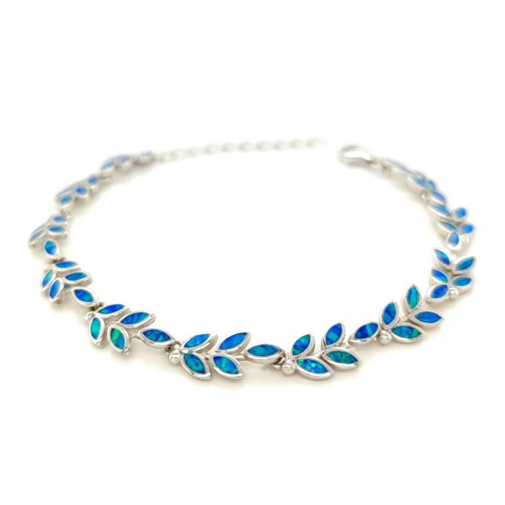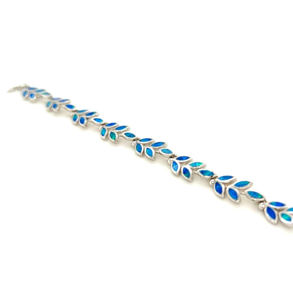 Γυναικείο βραχιόλι από ασήμι (925°) με φύλλο ελιάς και τεχνητό opal. Η ελιά για τους αρχαίους Έλληνες ήταν σύμβολο των ολυμπιακών ιδεωδών, της Ειρήνης, της Σοφίας και της Νίκης. Γι’ αυτό και το μοναδικό βραβείο που έπαιρνε ο Ολυμπιονίκης ήταν ένα στεφάνι φτιαγμένο από κλαδί ελιάς, ο «κότινος».