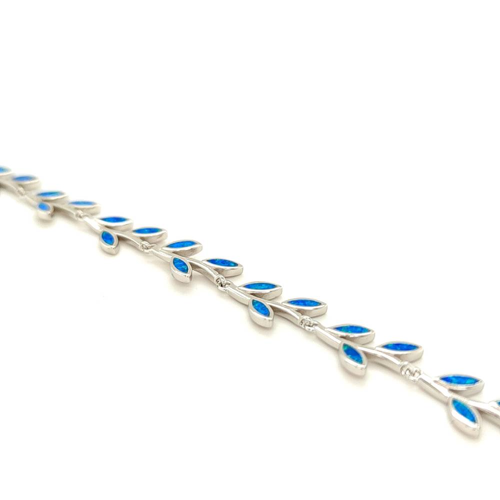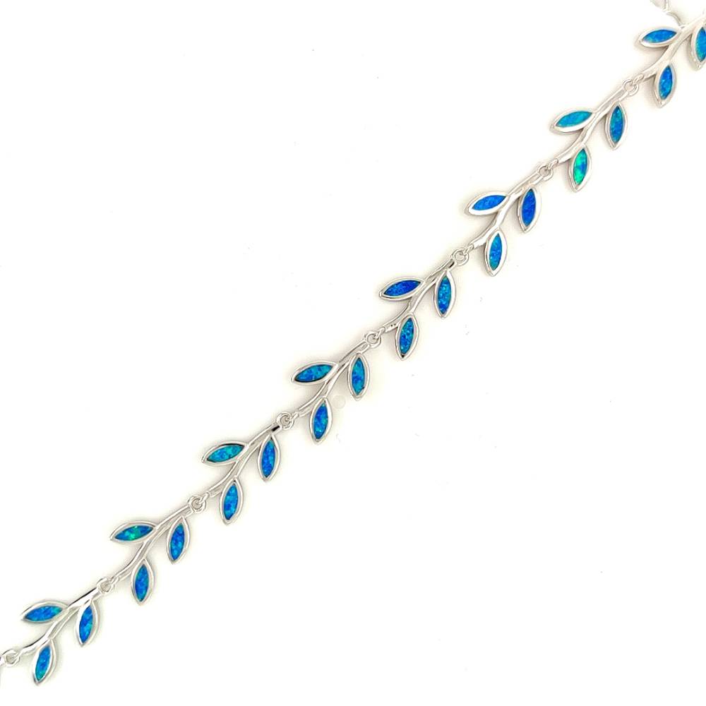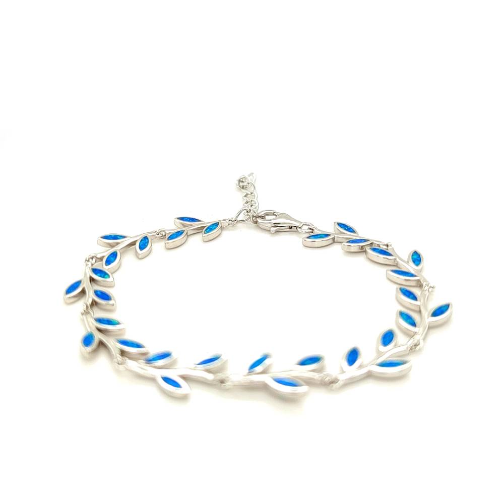 Γυναικείο βραχιόλι από ασήμι (925°) με φύλλο ελιάς και τεχνητό opal. Η ελιά για τους αρχαίους Έλληνες ήταν σύμβολο των ολυμπιακών ιδεωδών, της Ειρήνης, της Σοφίας και της Νίκης. Γι’ αυτό και το μοναδικό βραβείο που έπαιρνε ο Ολυμπιονίκης ήταν ένα στεφάνι φτιαγμένο από κλαδί ελιάς, ο «κότινος».
