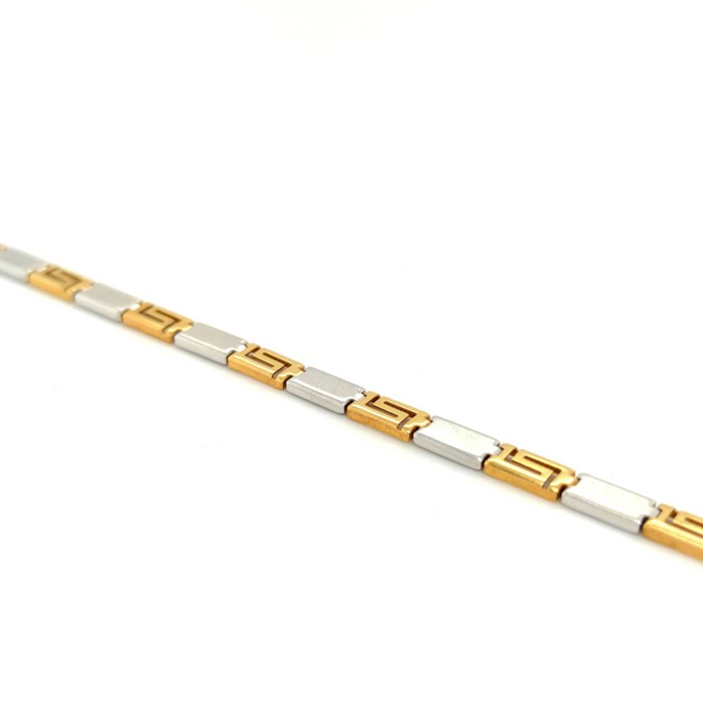 Ένα βραχιόλι γυναικείο με σύμβολο μαίανδρο, με χρυσή γυαλιστερή και ματ επιφάνεια. Το βραχιόλι είναι φτιαγμένο από κίτρινο και λευκό χρυσό Κ14 (585°). Ο Μαίανδρος είναι το αρχαιότερο ελληνικό σύμβολο, Νίκης και Ενότητας, σύμβολο του Άπειρου και της Αιώνιας Ζωής. Εμπνευσμένος, κατά την άποψη κάποιων ακαδημαϊκών, από τις πολυάριθμες στροφές του ποταμού Μαιάνδρου. Ο Μαίανδρος χρησιμοποιείται σε αγγεία, ναούς, μνημεία, γλυπτά, αντικείμενα, πολεμικά όπλα, πανοπλίες και κοσμήματα.