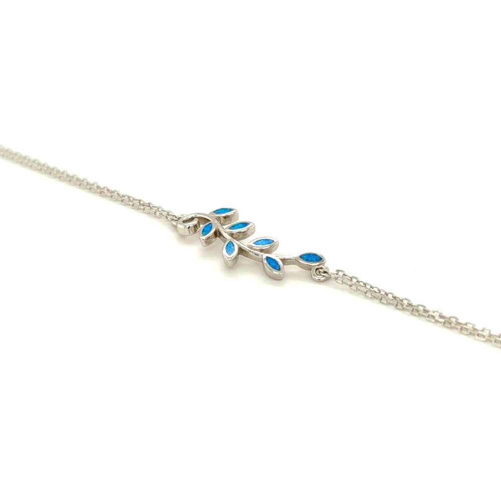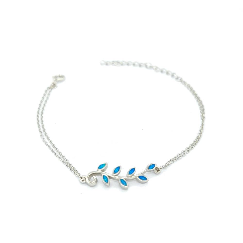 Γυναικείο βραχιόλι με διπλό αλυσιδάκι από ασήμι (925°) με φύλλο ελιάς και τεχνητό opal. Η ελιά για τους αρχαίους Έλληνες ήταν σύμβολο των ολυμπιακών ιδεωδών, της Ειρήνης, της Σοφίας και της Νίκης. Γι’ αυτό και το μοναδικό βραβείο που έπαιρνε ο Ολυμπιονίκης ήταν ένα στεφάνι φτιαγμένο από κλαδί ελιάς, ο «κότινος».
