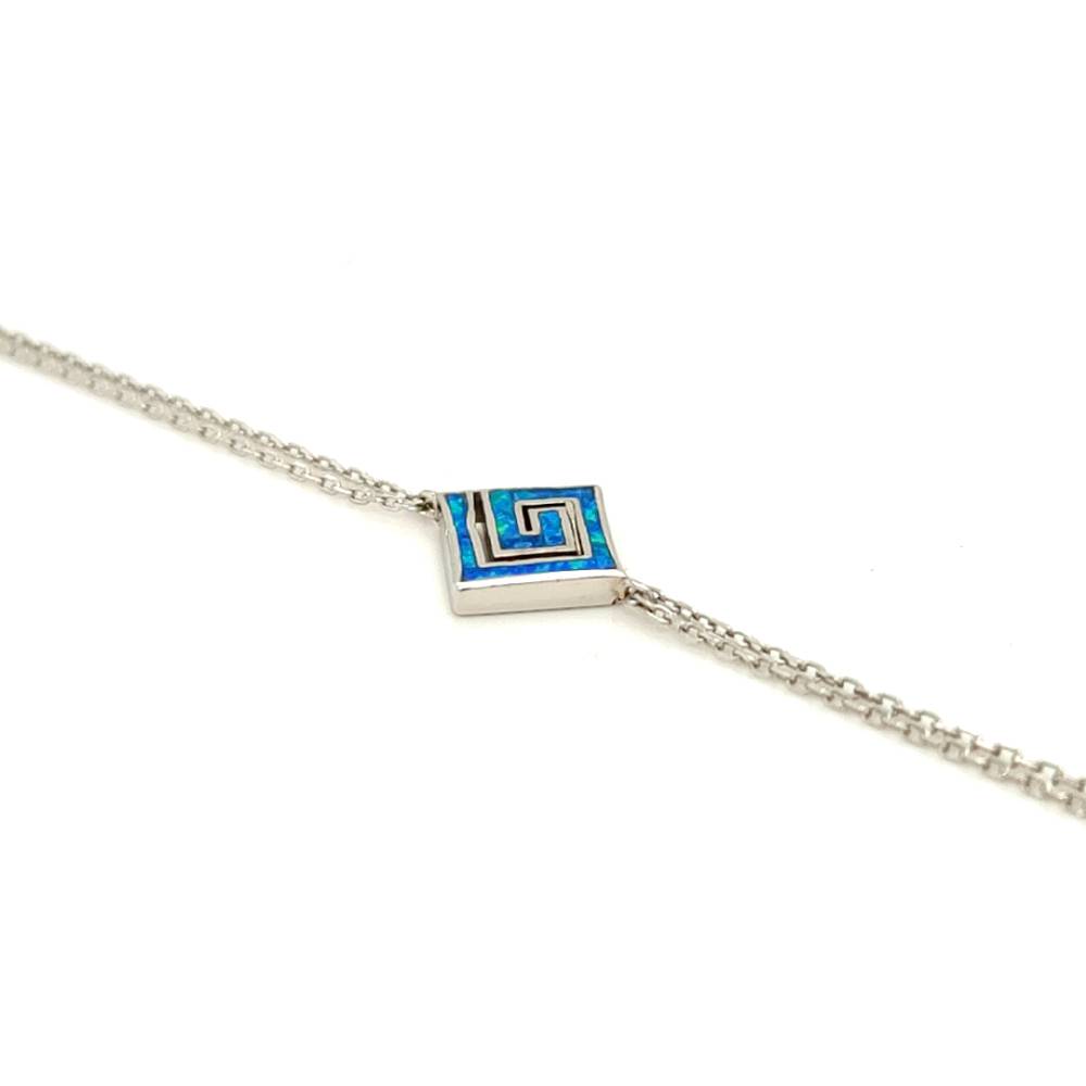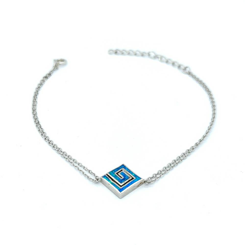 Γυναικείο βραχιόλι με διπλό αλυσιδάκι από ασήμι (925°) με σύμβολο Μαίανδρο και τεχνητό opal. Ο Μαίανδρος είναι το αρχαιότερο ελληνικό σύμβολο, Νίκης και Ενότητας, σύμβολο του Άπειρου και της Αιώνιας Ζωής. Εμπνευσμένος, κατά την άποψη κάποιων ακαδημαϊκών, από τις πολυάριθμες στροφές του ποταμού Μαιάνδρου. Ο Μαίανδρος χρησιμοποιείται σε αγγεία, ναούς, μνημεία, γλυπτά, αντικείμενα, πολεμικά όπλα, πανοπλίες και κοσμήματα.