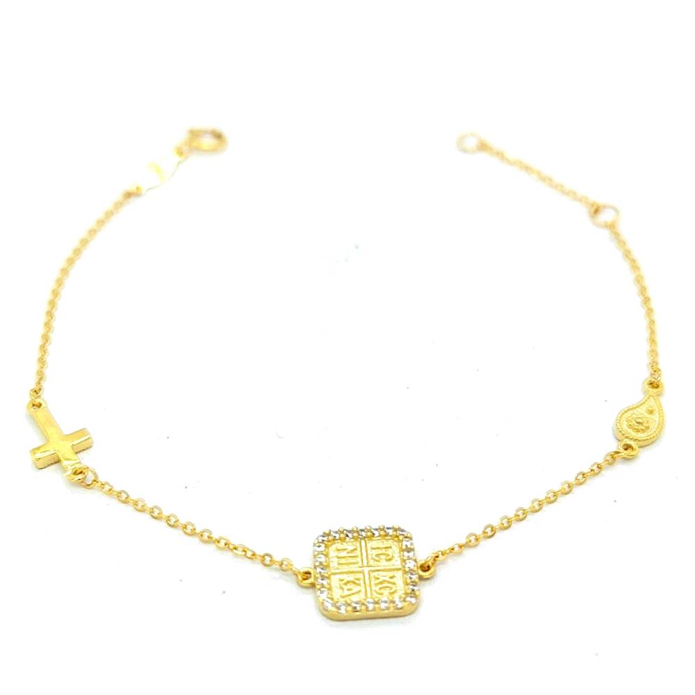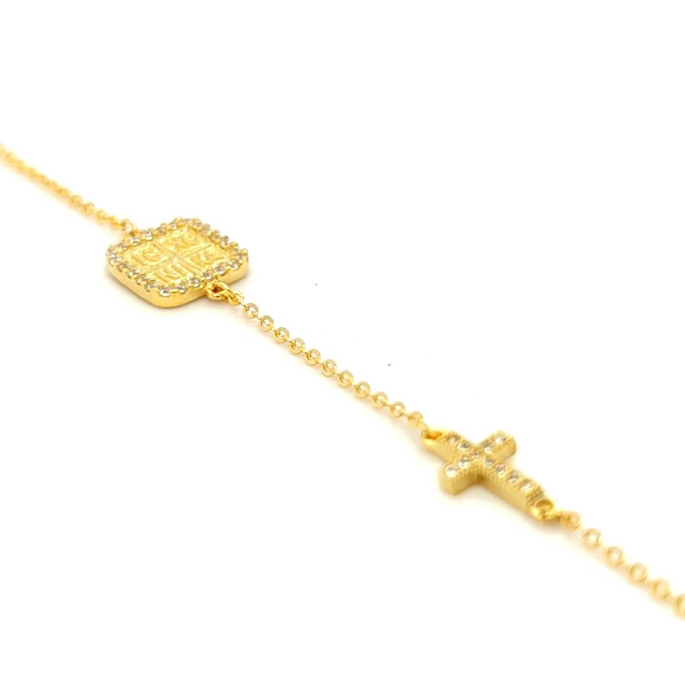 Βραχιόλι με φυλακτό με zircon σε σχήμα τετράγωνο, όπου στην πίσω όψη είναι χαραγμένο Αγιοκωνσταντινάτο . Η αλυσίδα είναι κοσμημένη με ένα σταυρό με zircon . Το βραχιόλι είναι φτιαγμένο από Χρυσό K9 (375°)