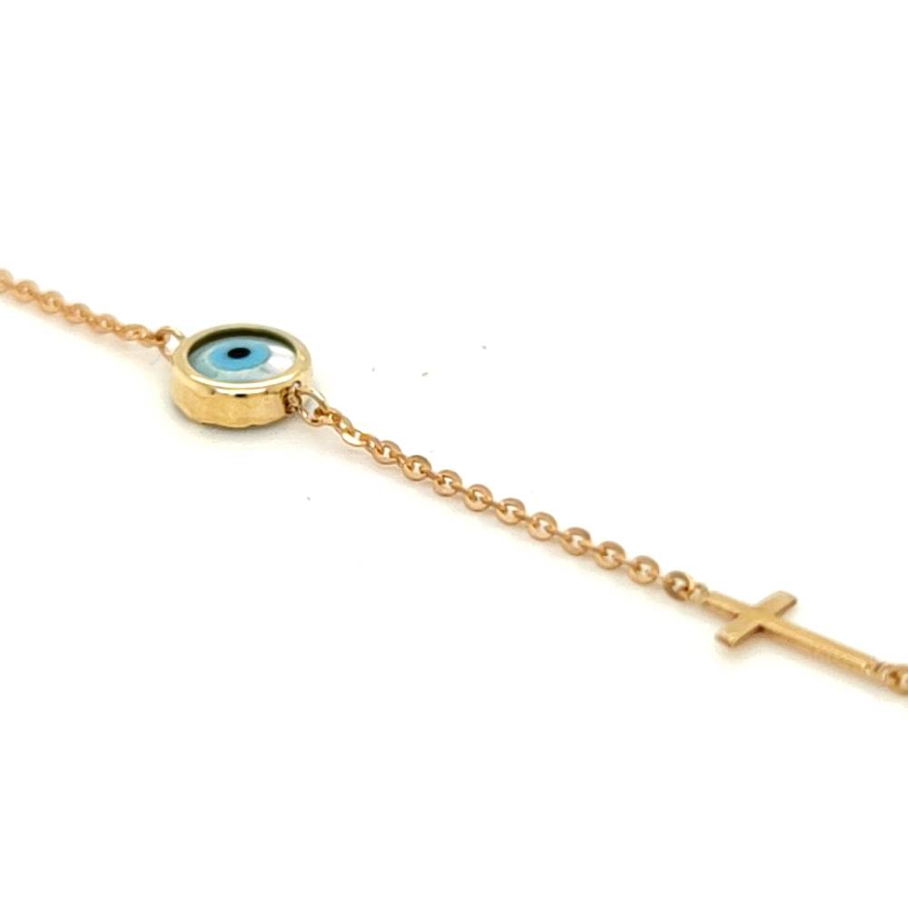 Βραχιόλι το οποίο είναι κοσμημένο με ένα στρογγυλό ματάκι και ένα σταυρό . Το βραχιόλι είναι φτιαγμένο από Χρυσό K14 (585°)