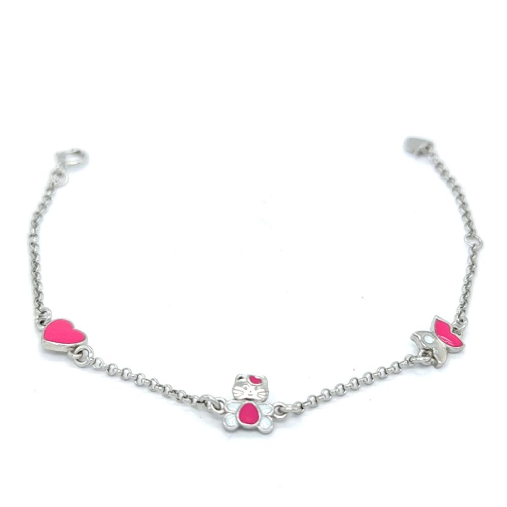 Ένα βραχιόλι παιδικό με 3 στοιχεία (καρδιά, γάτα, πεταλούδα) από ασήμι (925°).