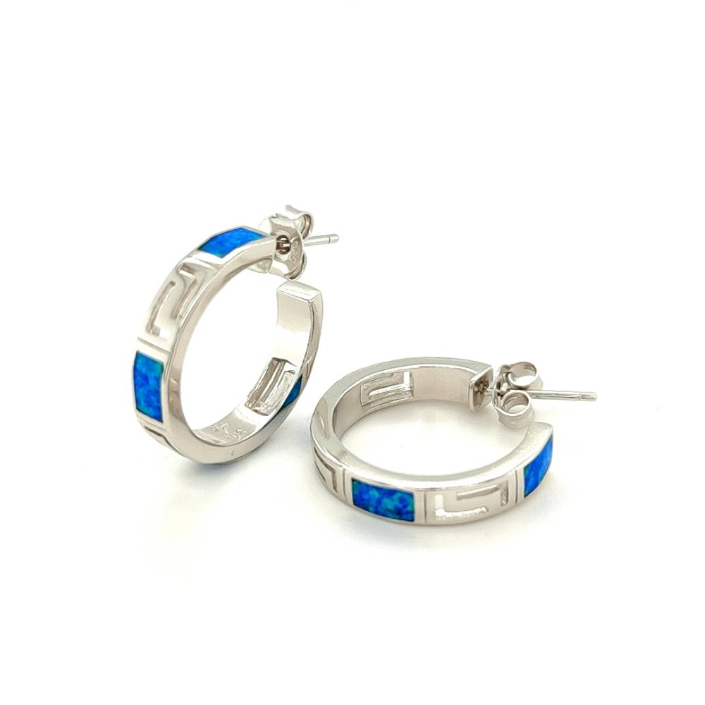 Women’s earrings hoops made of silver (925 °) with Meander symbol with artificial opal. Meander is the most ancient Greek symbol, Victory and Unity, a symbol of Infinity and Eternal Life. Inspired, in the opinion of some academics, by the numerous turns of the river Meander. Meander is used in pottery, temples, monuments, sculptures, objects, weapons, armor and jewelry.