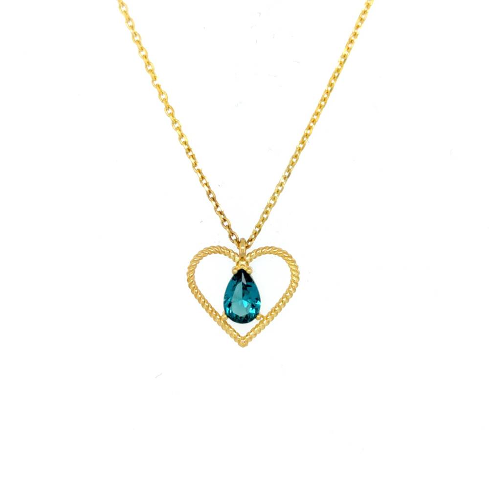 A women’s necklace made of gold K9 (375°) with a heart adorned with zircon in petrol color in the shape of a drop.