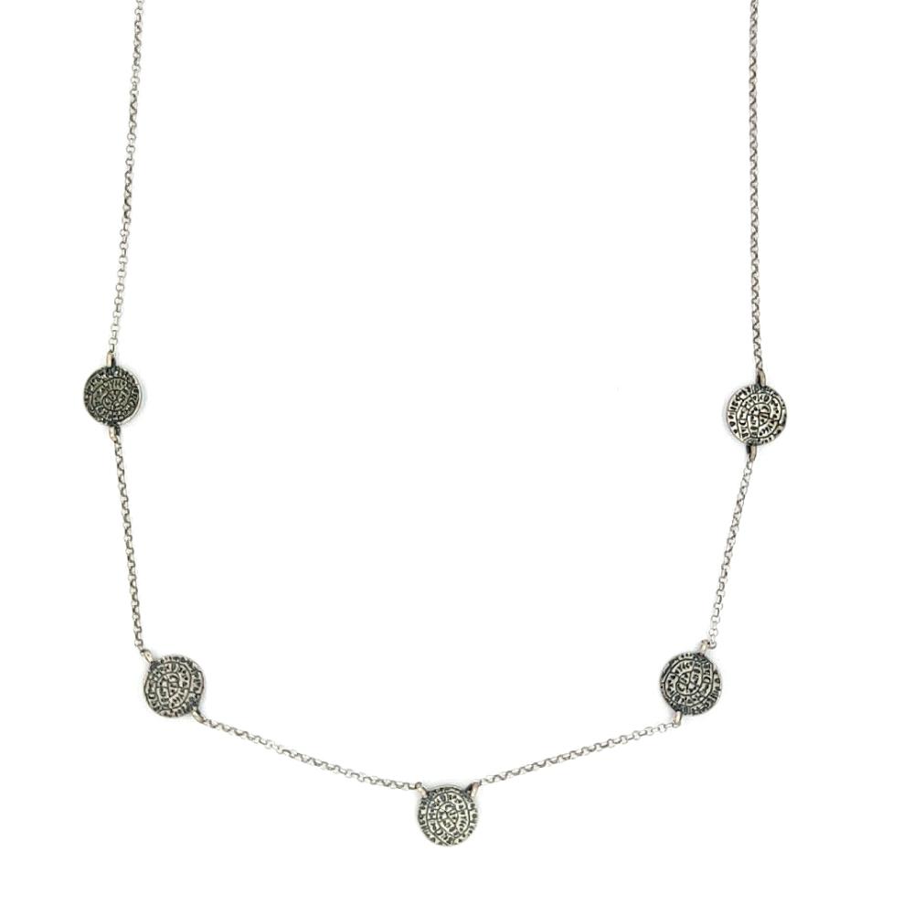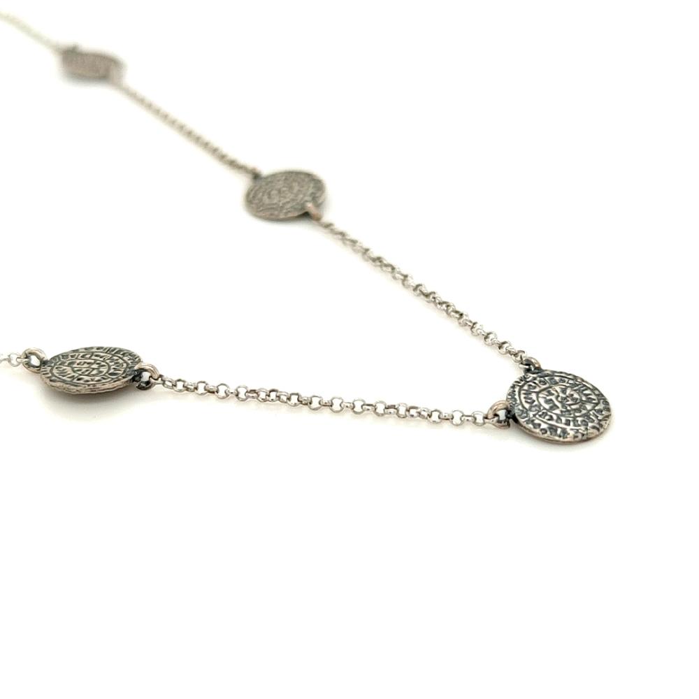 Women’s necklace made of silver (925 °) with the Disc of Phaistos. The Disc of Phaistos is a disc of baked clay, which is an archaeological find from the Minoan city of Phaistos in southern Crete and probably dates to the middle or late Minoan Bronze Age. It is one of the most famous mysteries of archeology, since the purpose of its construction remains unknown. The meaning of what is written in it is still unknown.