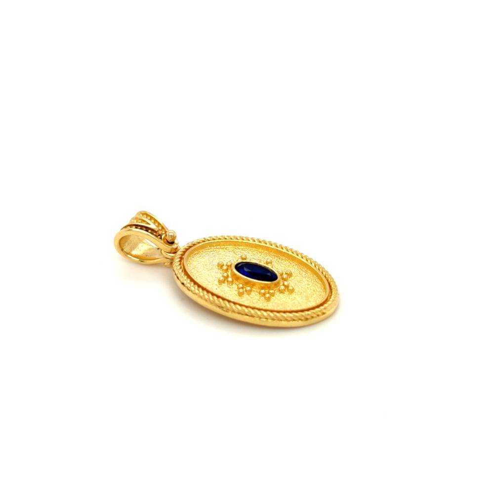 A women’s pendant of Byzantine aesthetics in the shape of oval adorned by a central blue zircon. The pendant is made of gold K9 (375°).