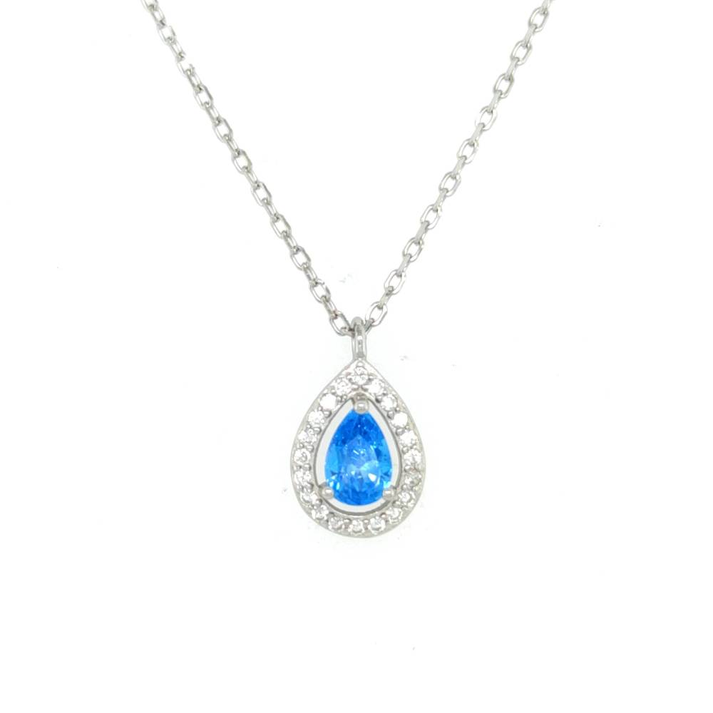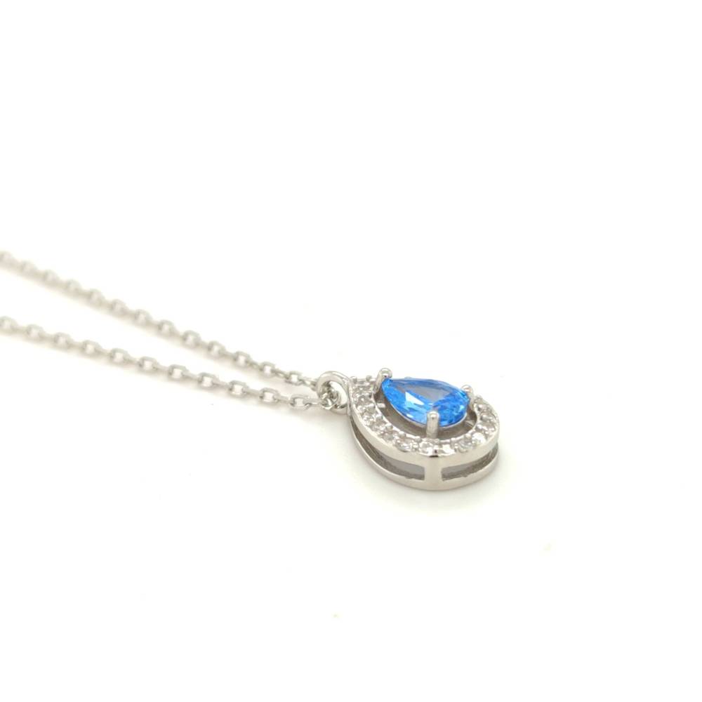 Silver women’s necklace (925°) with teardrop-shaped rosette with white and blue zircon.